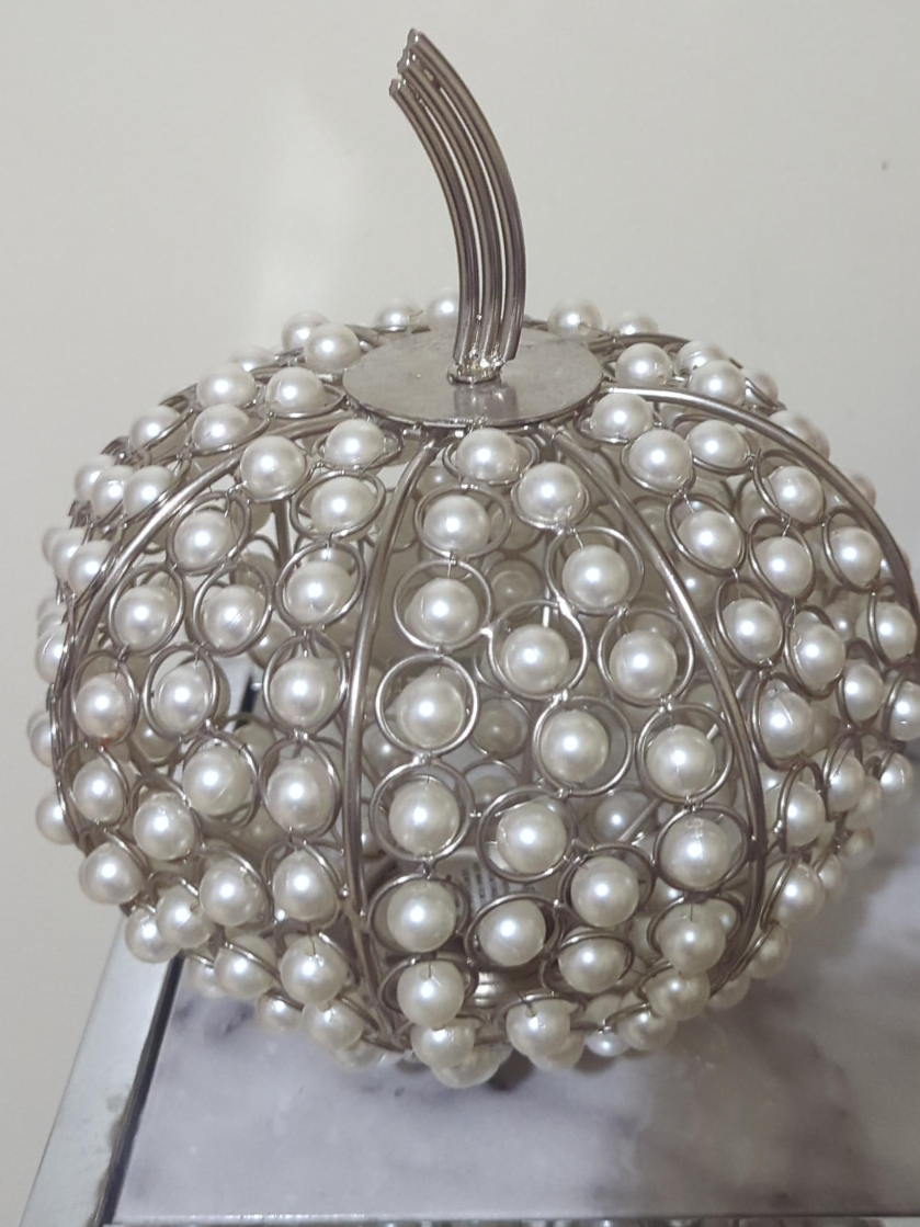 Here's a beautiful decorative pumpkin made of pearls and metal. It's a nice piece to add to your home decor!