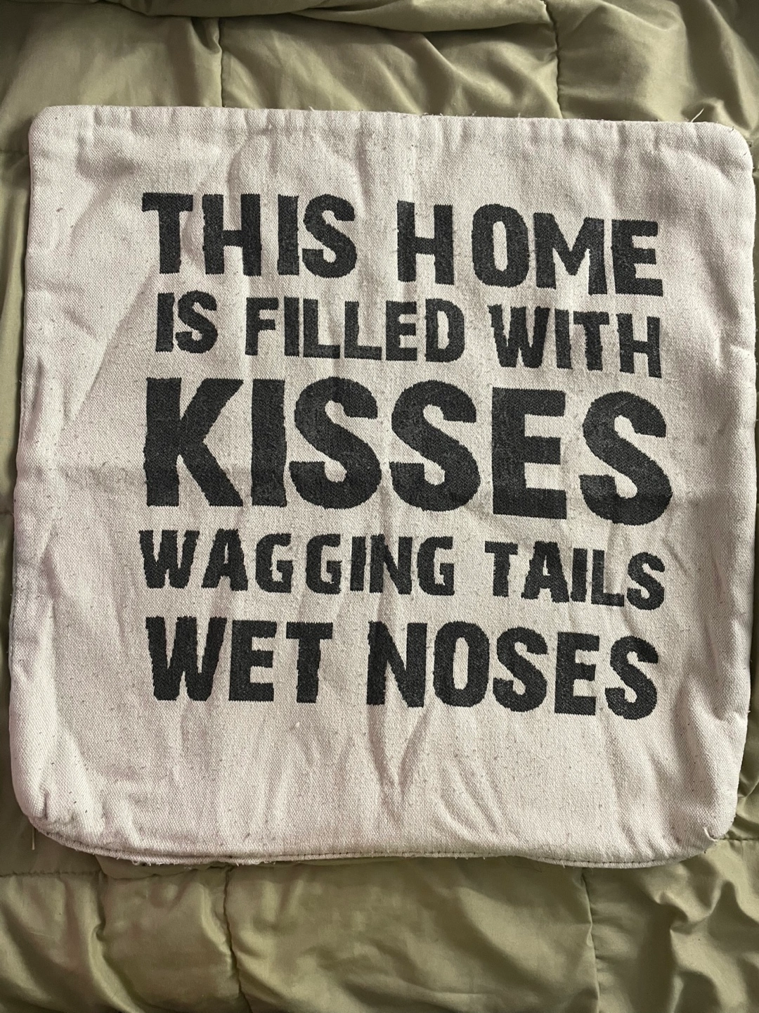 I'm selling a decorative pillow cover. It features the phrase "This home is filled with kisses, wagging tails, wet noses" printed on it. It's 20x20 inches and has a zipper closure.