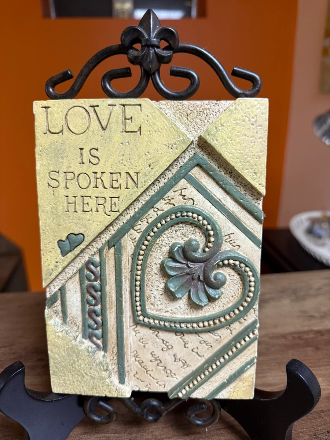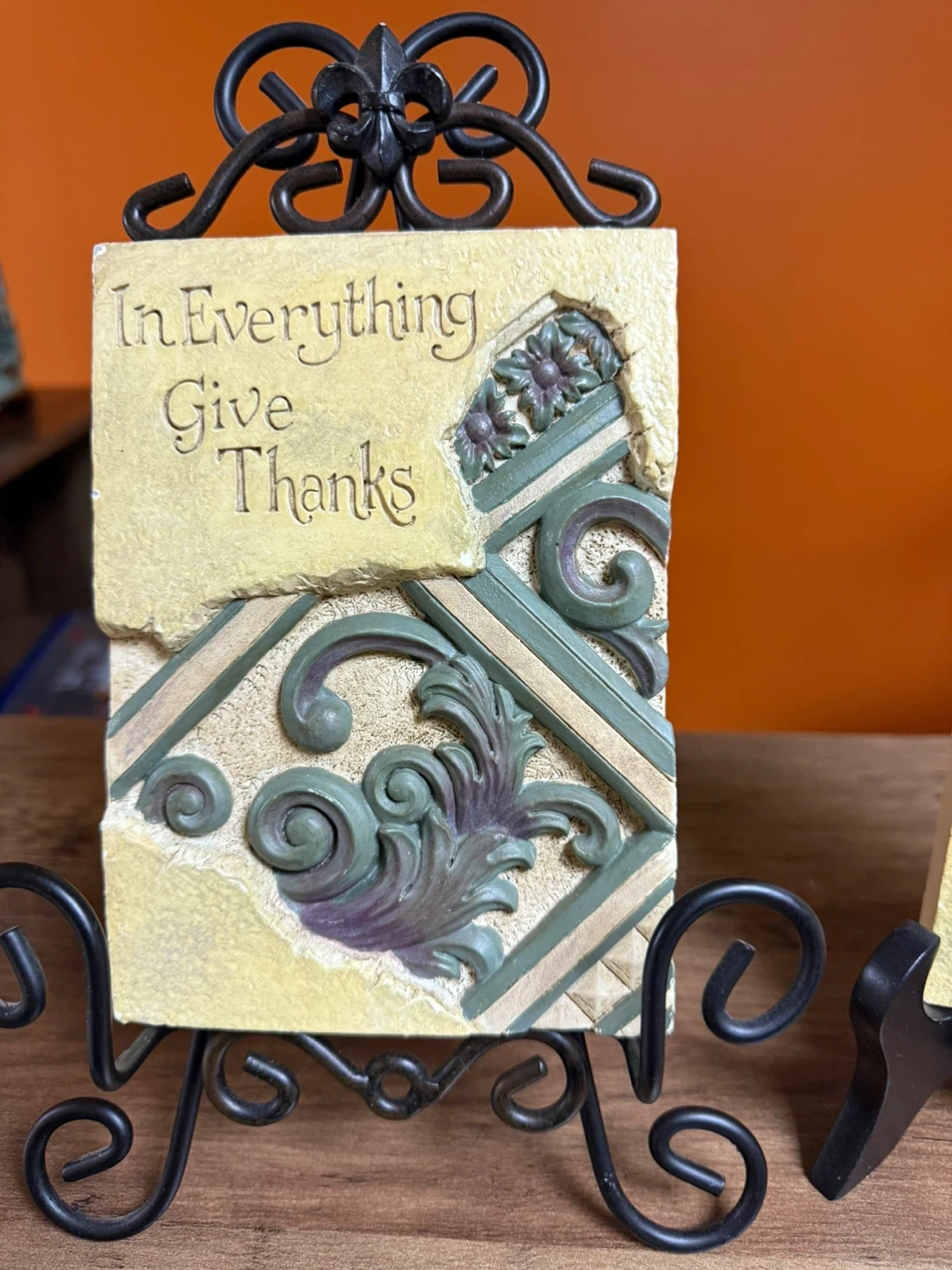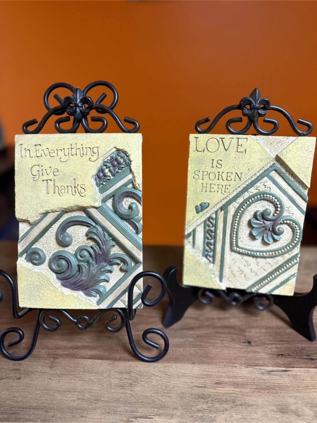Here's a set of two decorative plaques, each with its own stand. One plaque says "In Everything Give Thanks" and the other says "Love is Spoken Here". They would look great in any room