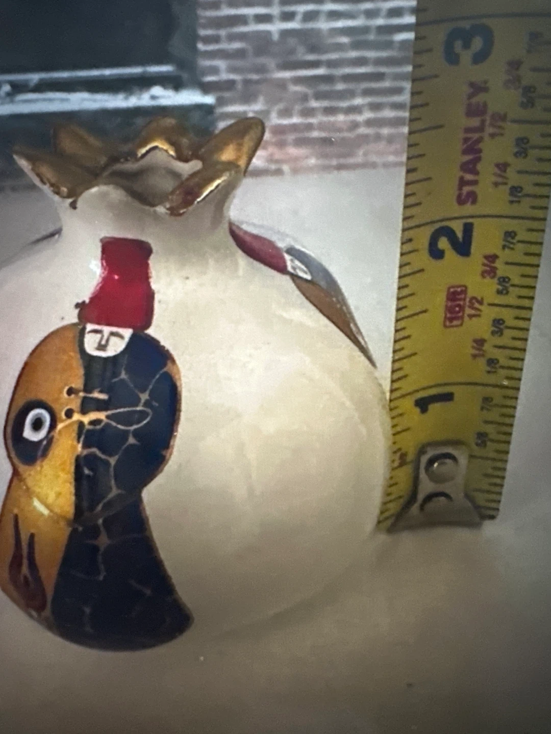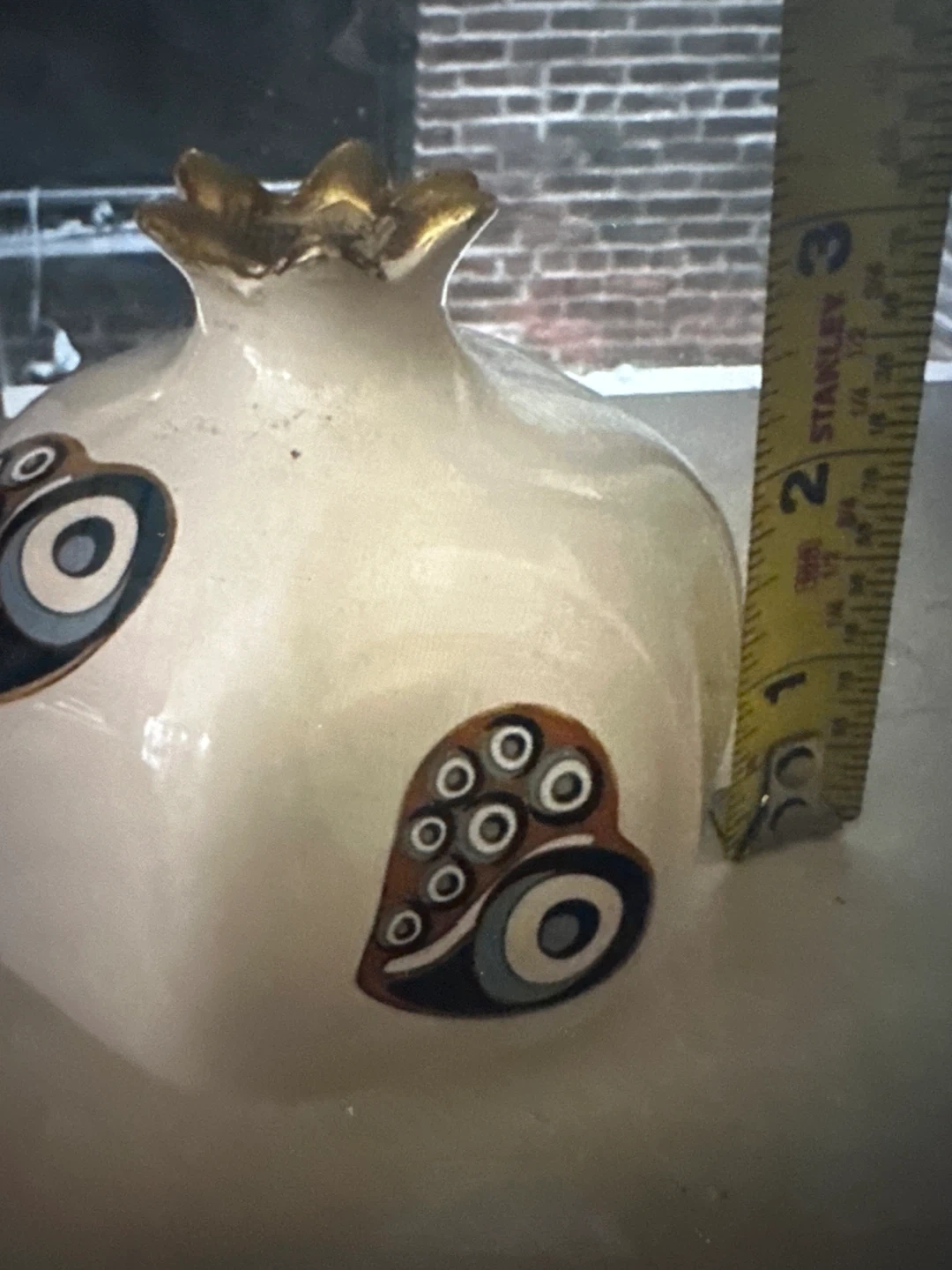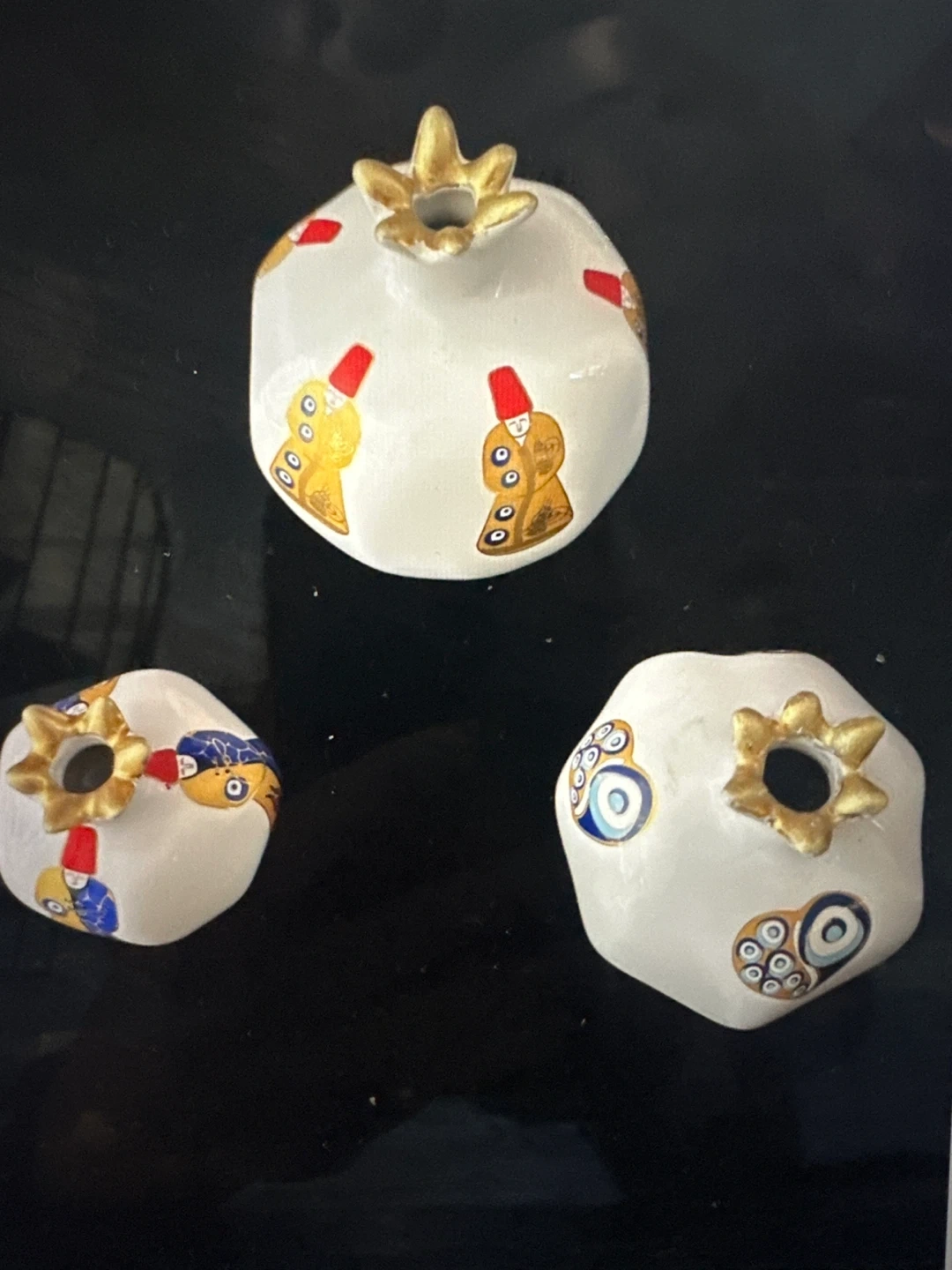 Here are three decorative pomegranate figurines. They are white with gold accents and have different designs on them. One is about 4 inches tall. They are in 3 different sizes, small, medium and large. Measurements in the picture