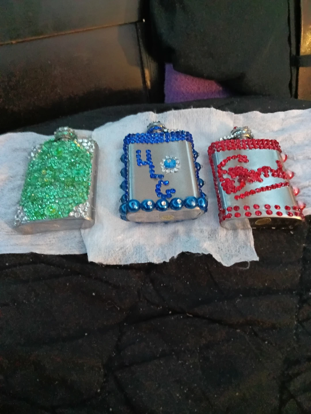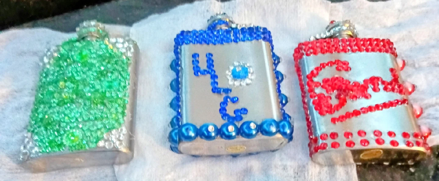 10Selling a decorative rhinestone flask in green. It's embellished with sparkling rhinestones, adding a touch of glam to your collection