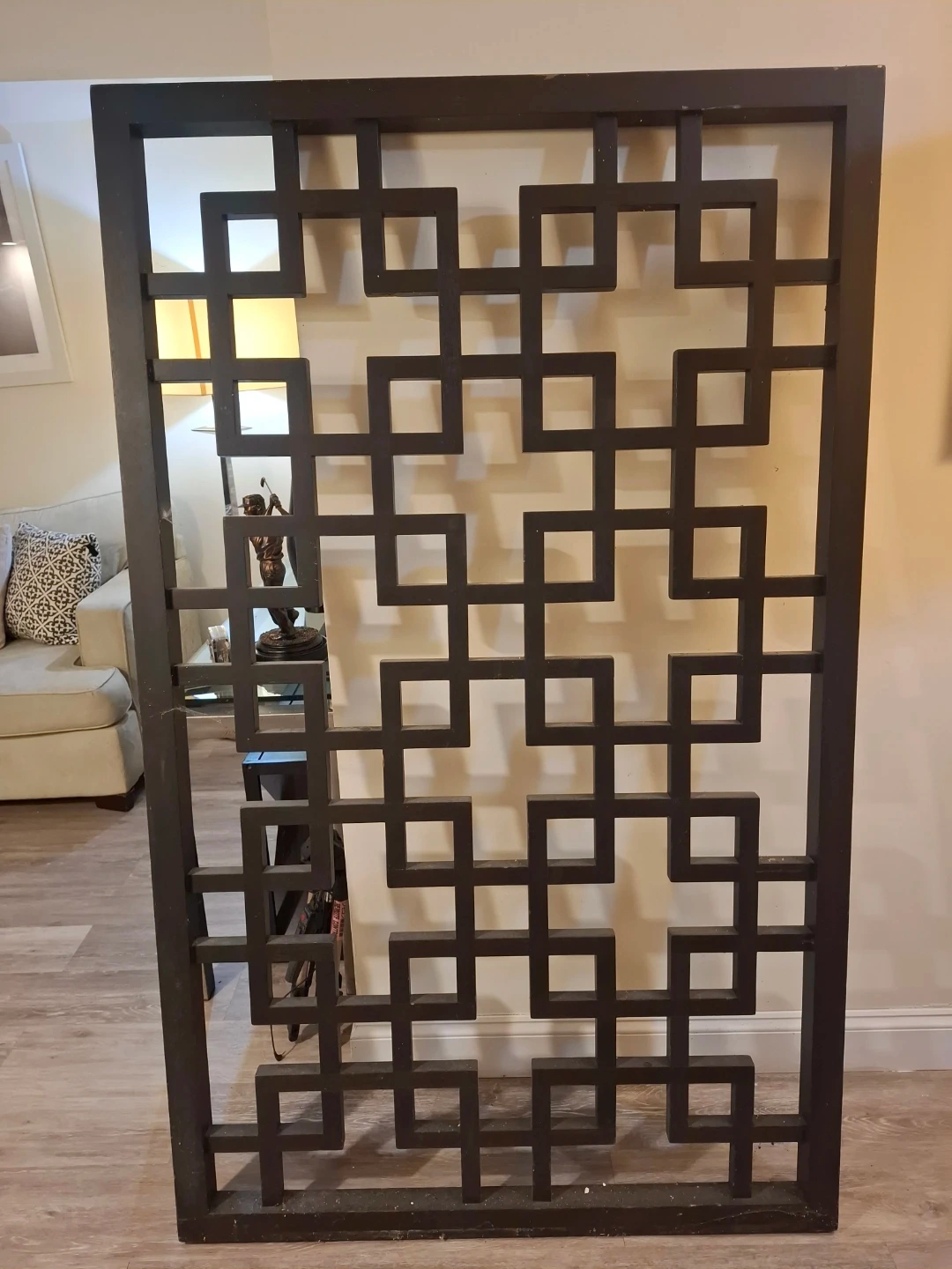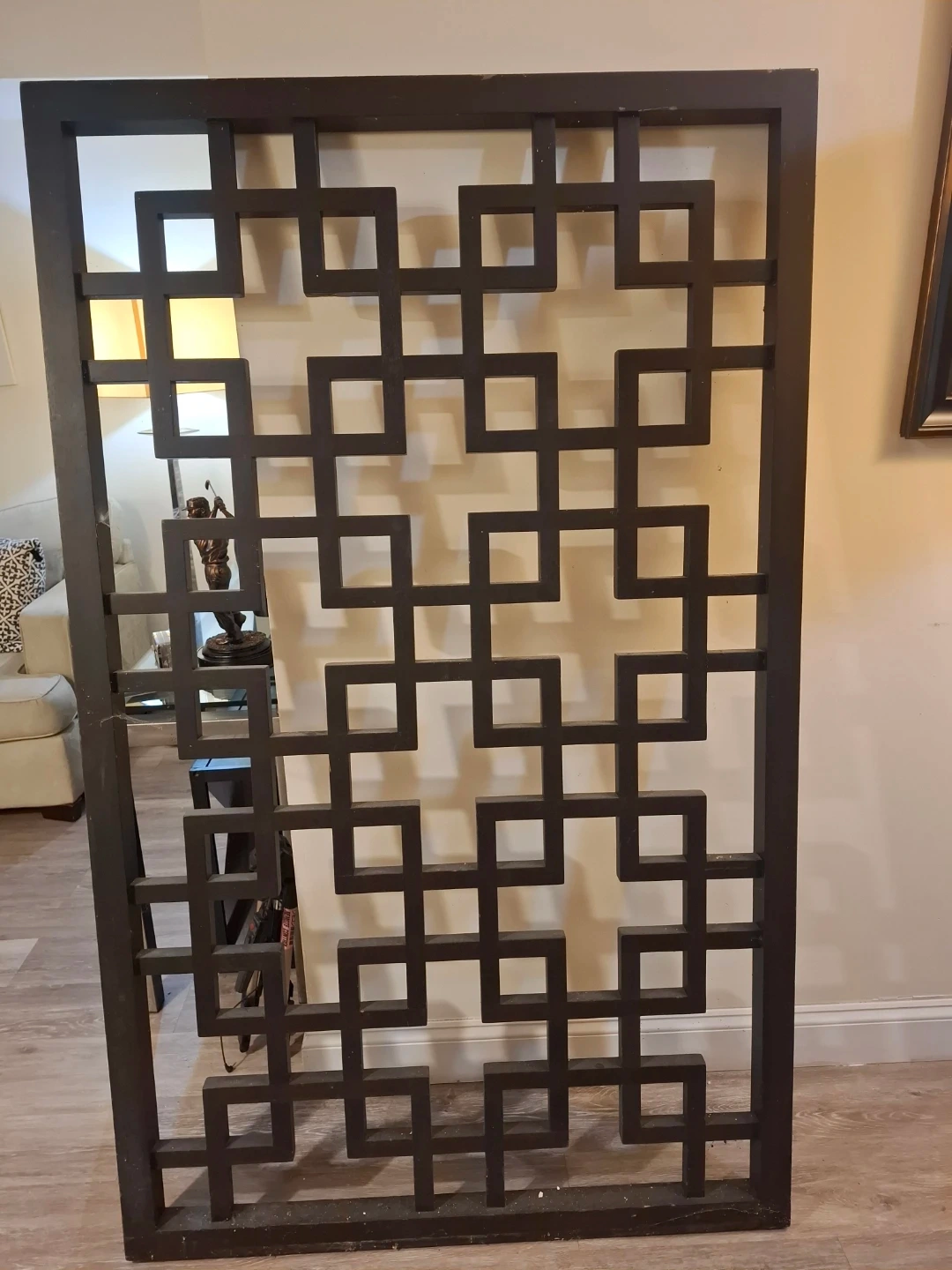 86This is a decorative room divider screen featuring a geometric square pattern. It's a stylish way to add some privacy or divide a space in your home. It has a dark color and its made of wood. Size 42×69 inches
