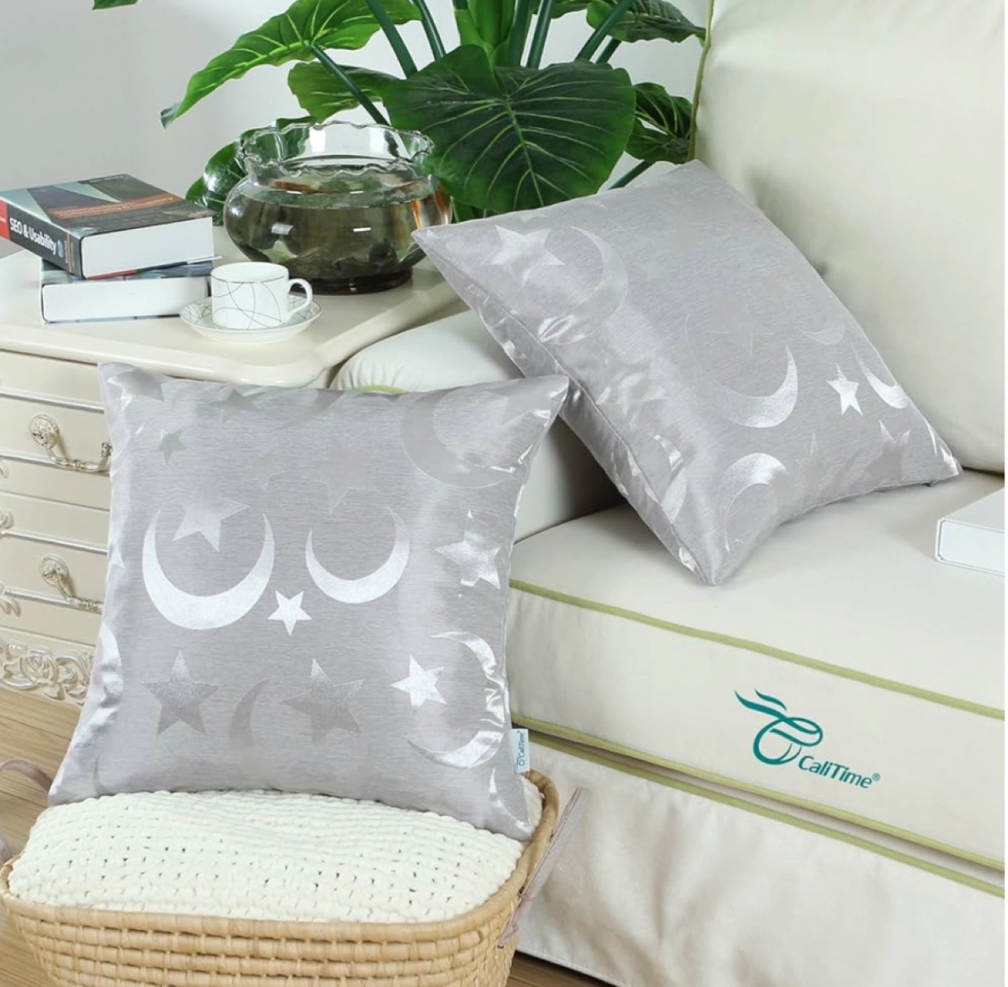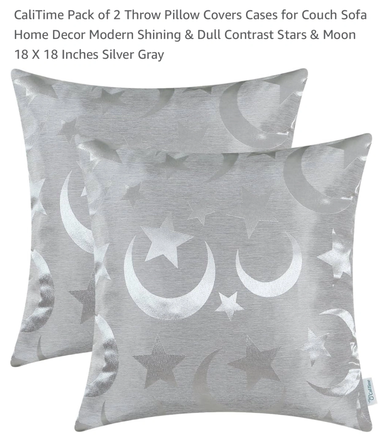 195CaliTime pack of 2 throw pillow covers for couch/sofa/bed. Home decor. Modern shining & dull contrast stars & moon. 18 X 18” in silver grey. Polyester blend. Silver-grey. Price listed OBO *pillows not included