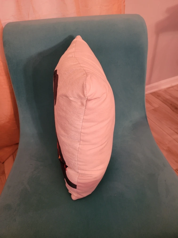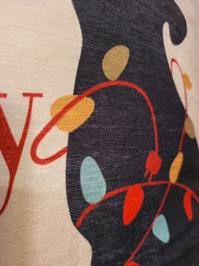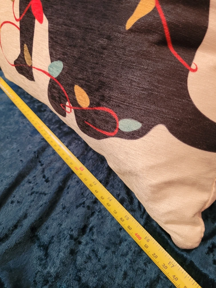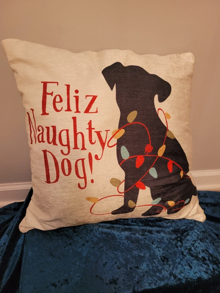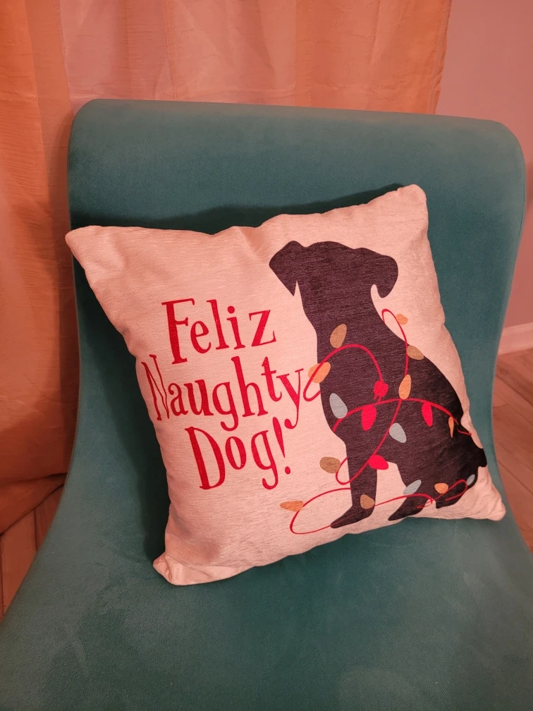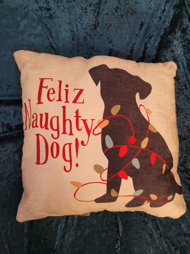 85Add a touch of festive fun to your home with this decorative throw pillow! The design features a cute dog silhouette tangled in Christmas lights, with the playful text "Feliz Naughty Dog!". It's perfect for adding a cozy and cheerful vibe to any room. Cream colored. Just under 17 inches length and width. Good condition smoke free. Nice soft fabric. 100% Polyester