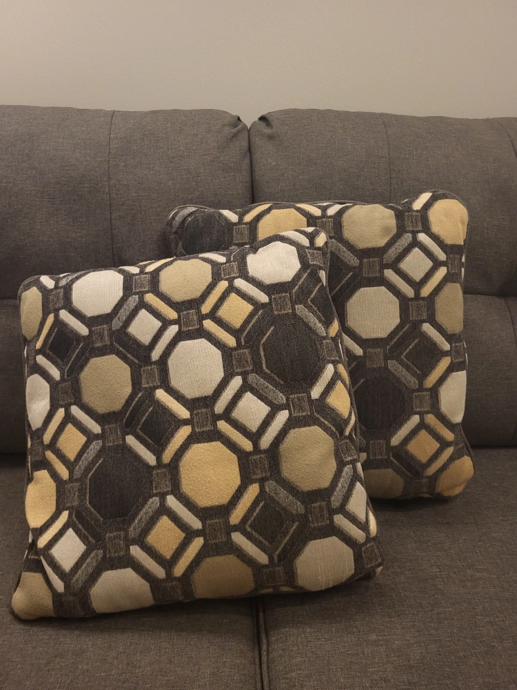 Selling a set of two decorative throw pillows! They feature a geometric pattern in shades of gray, beige, and brown. These pillows are in great condition and ready to add a stylish touch to your living room or bedroom