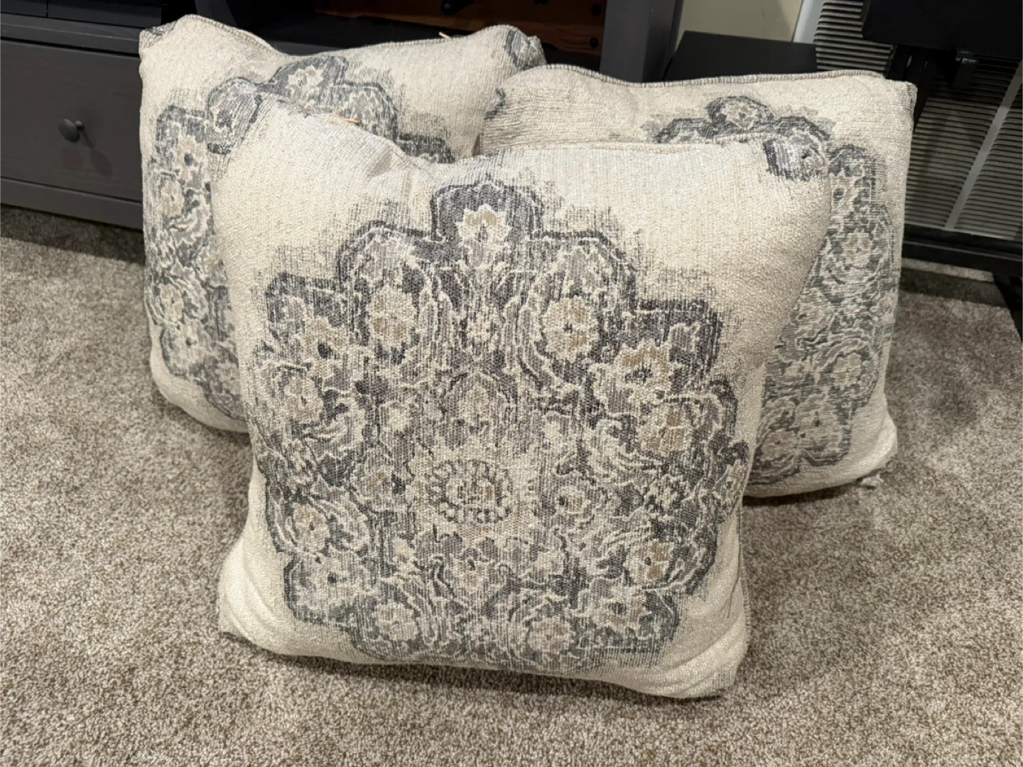Selling a set of three decorative throw pillows! They feature a neutral color palette with a detailed, symmetrical pattern. Perfect for adding a touch of elegance to your living room or bedroom.