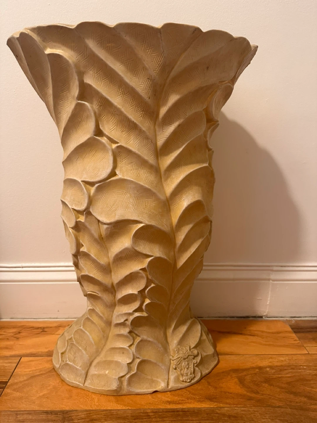 This is a decorative vase with a unique leaf-like pattern. It has a beige color and would be a great addition to any room. It measures approximately 22 inches tall.