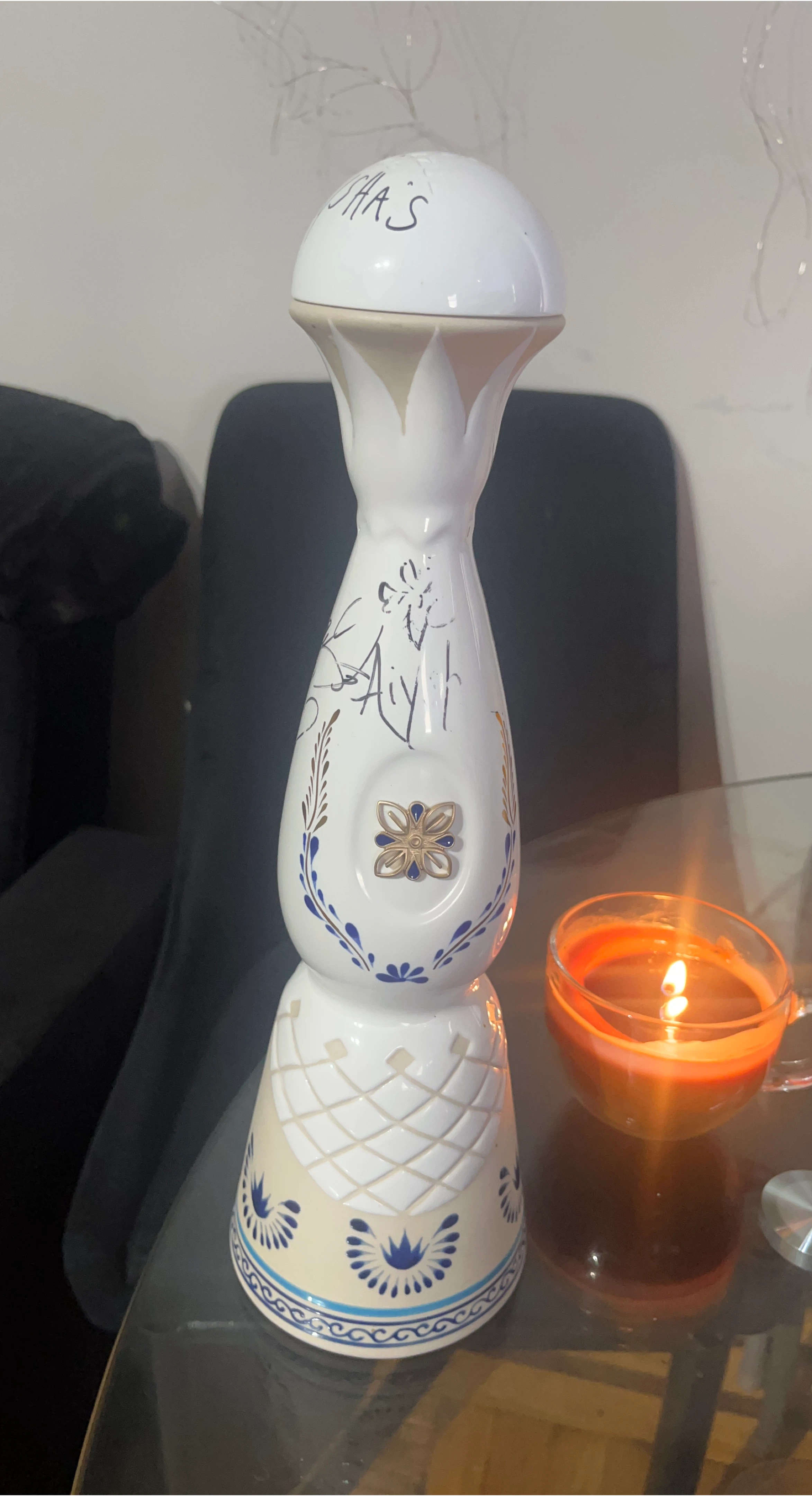 Selling a unique decorative vase with a beautiful design! It features a white top and a patterned body with blue and gold accents. Perfect for adding a touch of elegance to any room