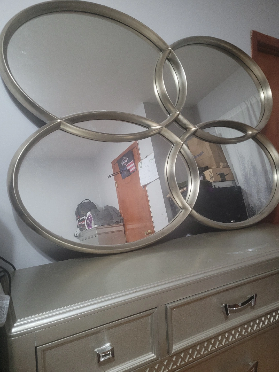Selling a decorative mirror. It has a unique design with interconnected circles. The mirror is in good condition and would make a great addition to any room