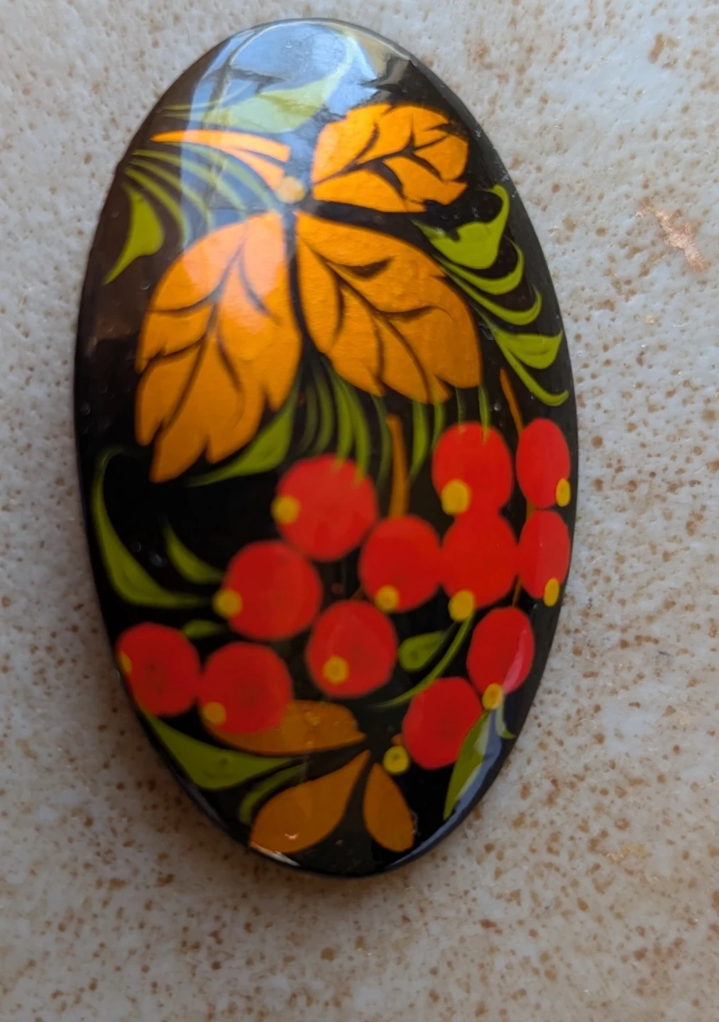 This is a beautiful oval Russian wooden brooch with a hand-painted design. It features vibrant red berries and orange-yellow leaves on a dark background. The pin is attached to the back for easy wear. It's a lovely decorative piece!