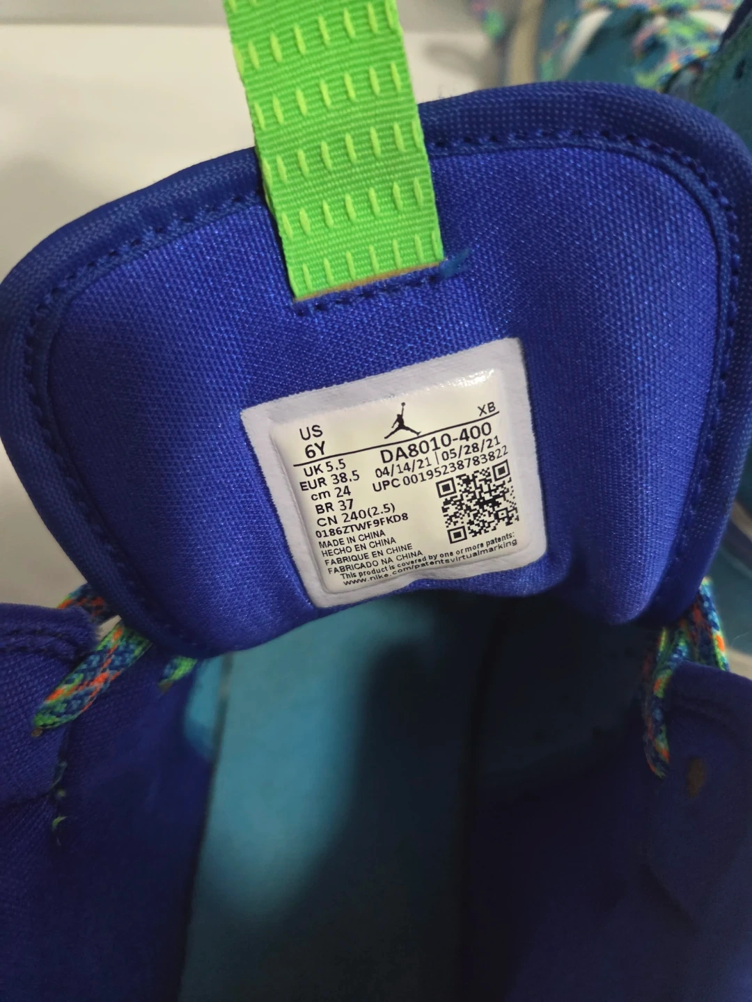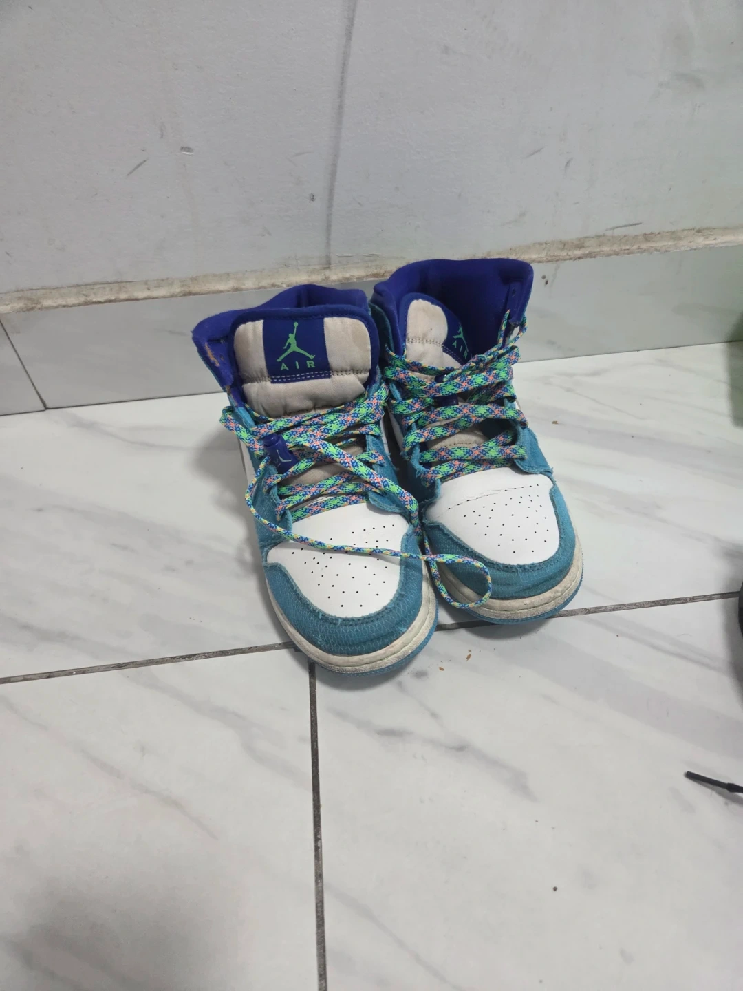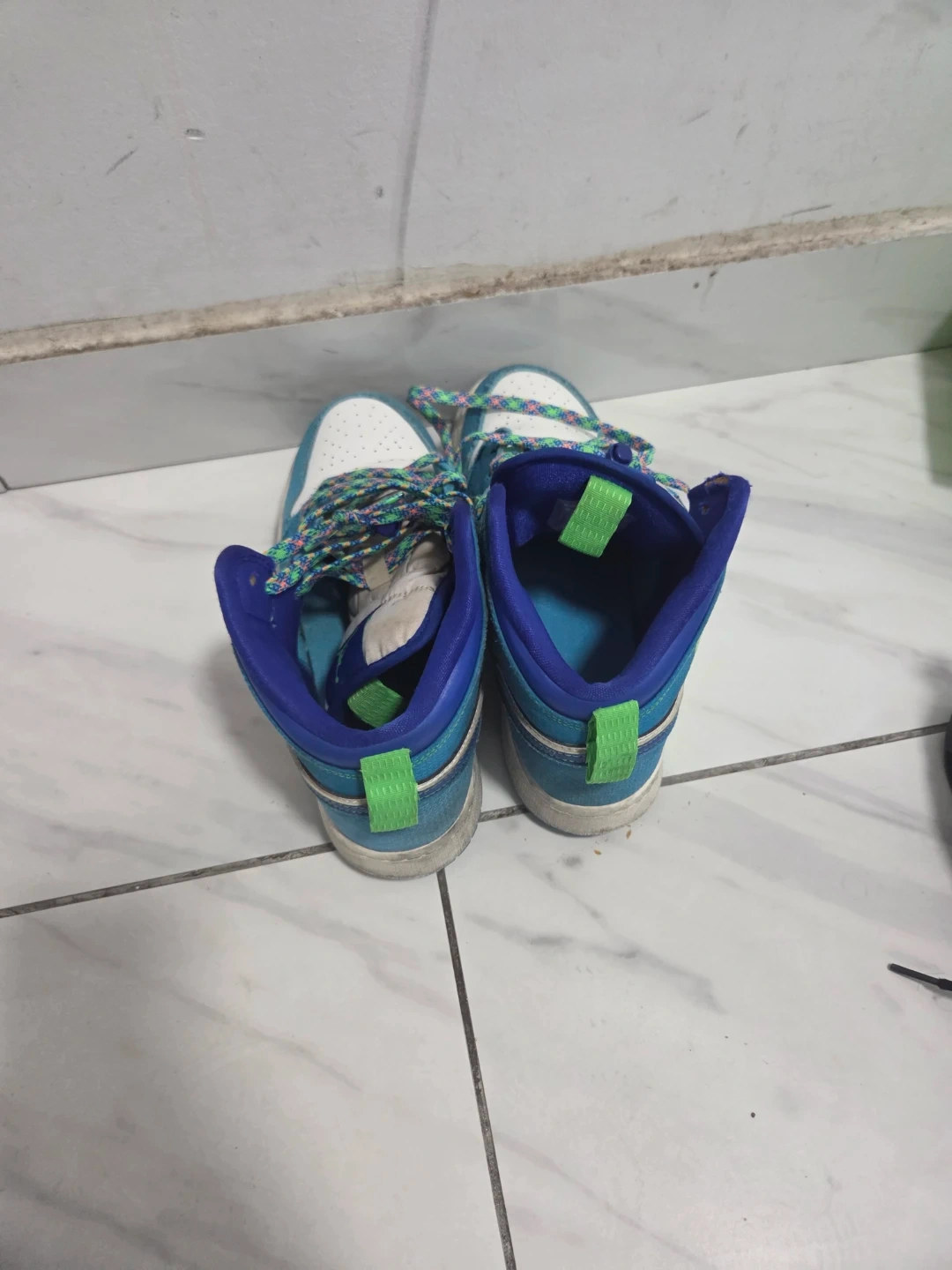 Kids' Jordan Air 1 Mid SE para obre-color blue, white, and green design. Youth size 6Y. These sneakers feature a mid-top silhouette and a classic lace-up closure. Perfect for casual wear or sports activities!