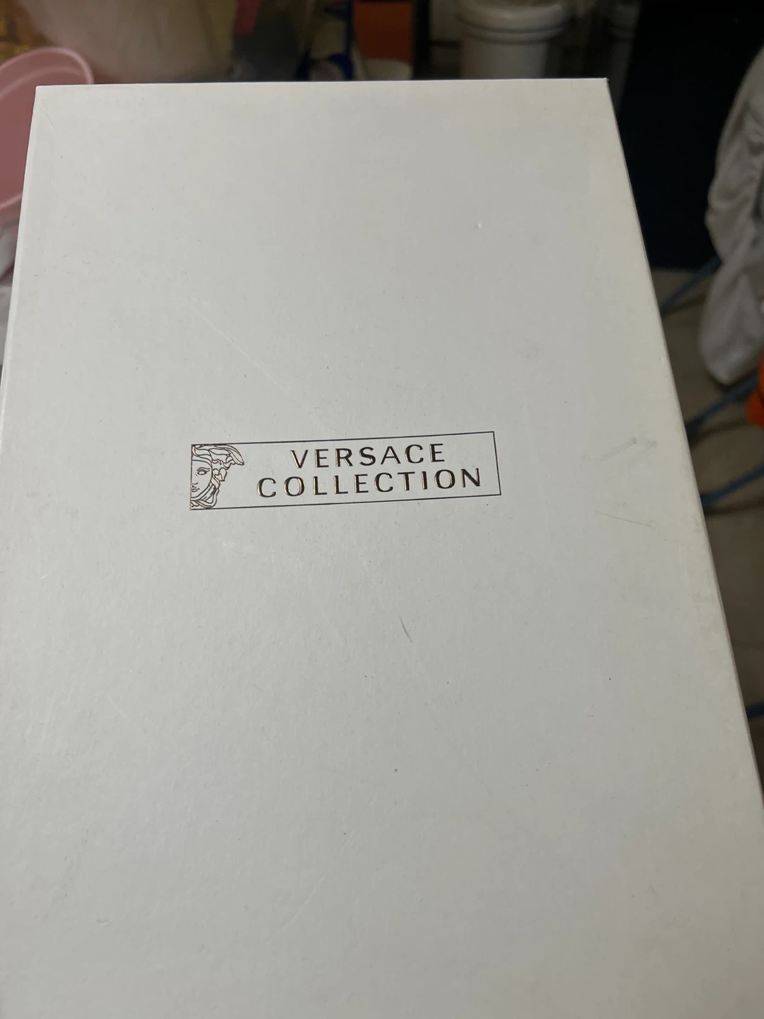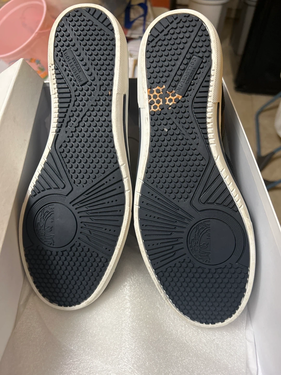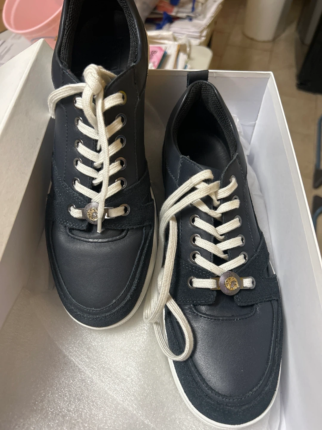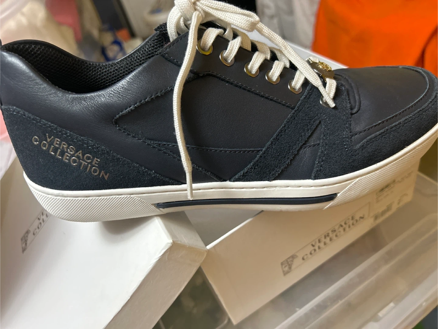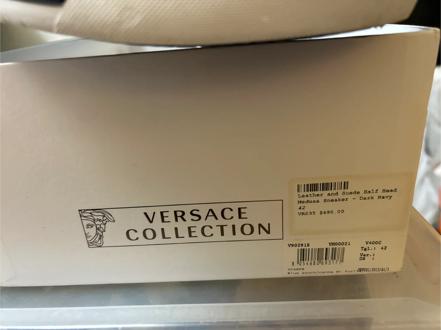 Versace Collection Medusa sneakers in dark navy. Made with leather and suede. Includes original box. Original price $495.00