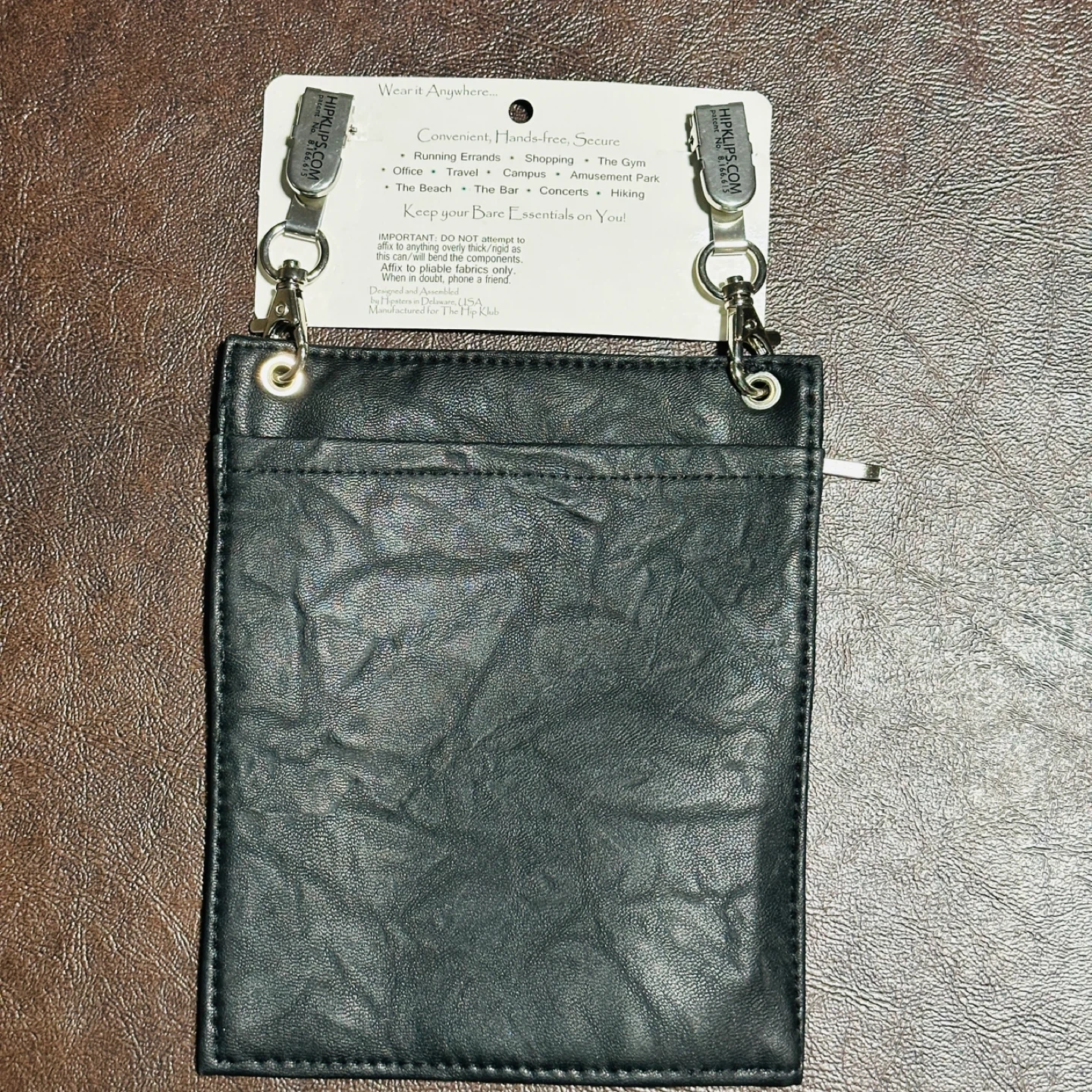 This HIP KLIP is a cell pocket accessory made of black material. It's designed to be worn on your belt or waistband, offering a hands-free and secure way to carry your phone and essentials. It fits large phones and features multiple zippered pockets. Worry-free security!