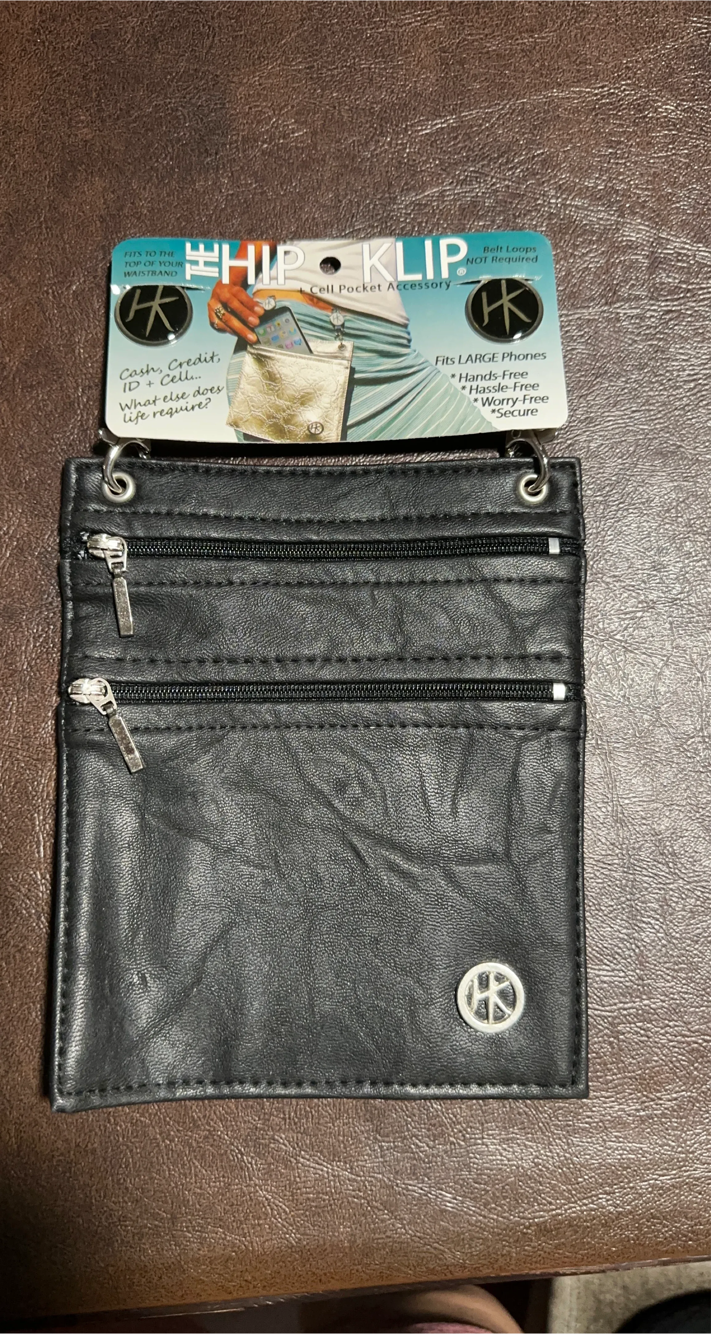 This HIP KLIP is a cell pocket accessory made of black material. It's designed to be worn on your belt or waistband, offering a hands-free and secure way to carry your phone and essentials. It fits large phones and features multiple zippered pockets. Worry-free security!