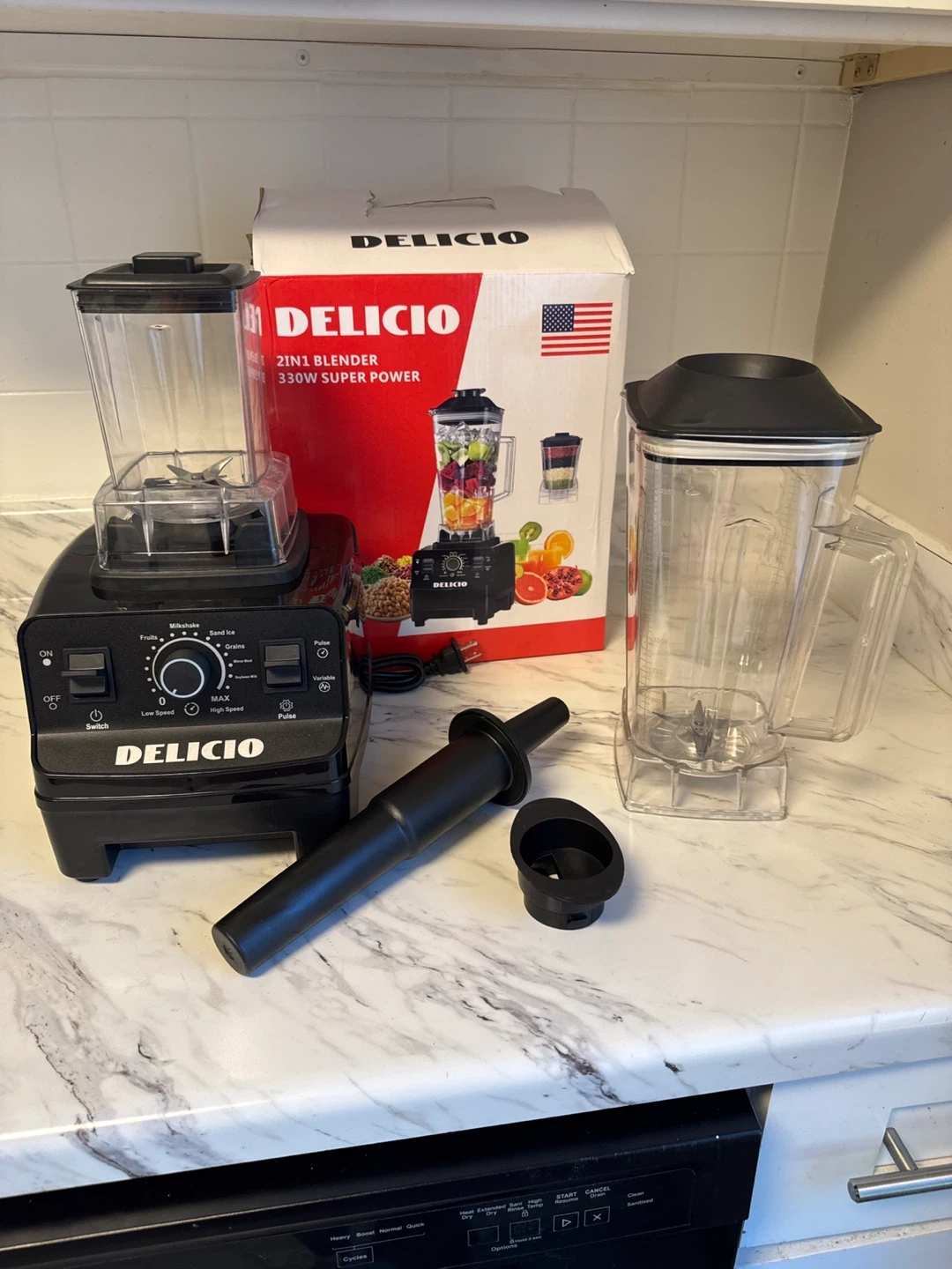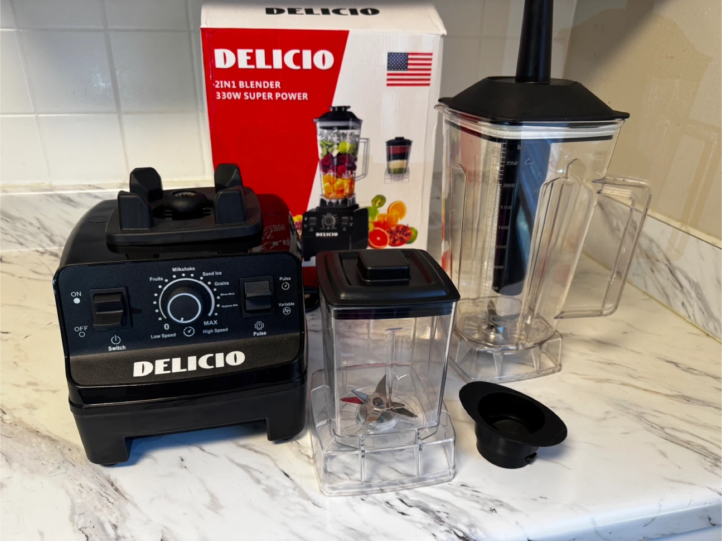 10Selling a Delicio 2in1 blender with 330W super power! This blender is perfect for making smoothies, shakes, and more. It comes with all the components pictured, including the base, large blending jar, small blending jar, and other accessories. The box is also included!
