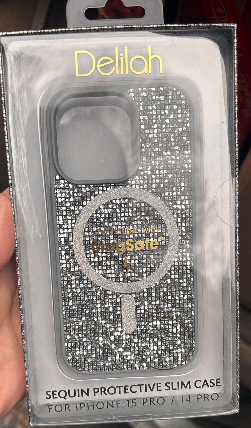 256Silver sequined phone case compatible with MagSafe. For iPhone 15 Pro/14 Pro