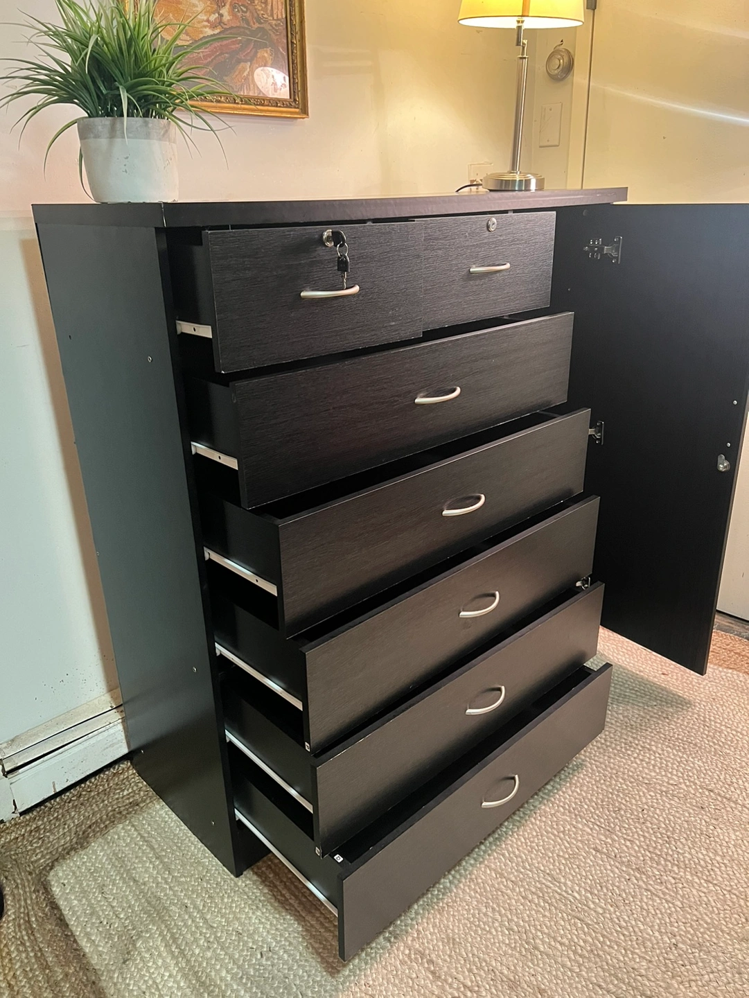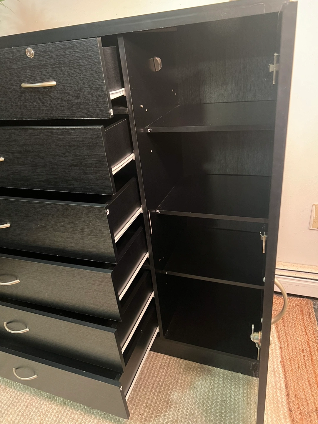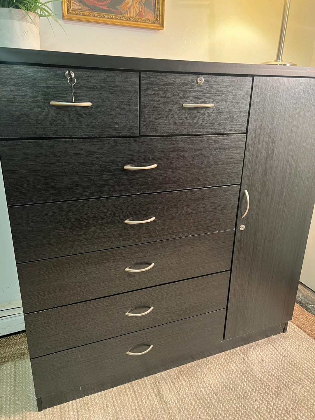 415Functional dresser with seven drawers and cabinet that has four shelves. All drawers open and close smoothly. There is some cosmetic wear from normal usage but noting major. The top two drawers lock key works but the cabinet door lock doesn’t. You may replace if you wish. They are few bucks from Amazon. Measurement - 8” x 47.25” x 48.5” (LxWxH) Venmo, Zelle, CashApp, PayPal or cash are accepted for payment. Delivery is available for extra fee. Fee varies depending on your location.