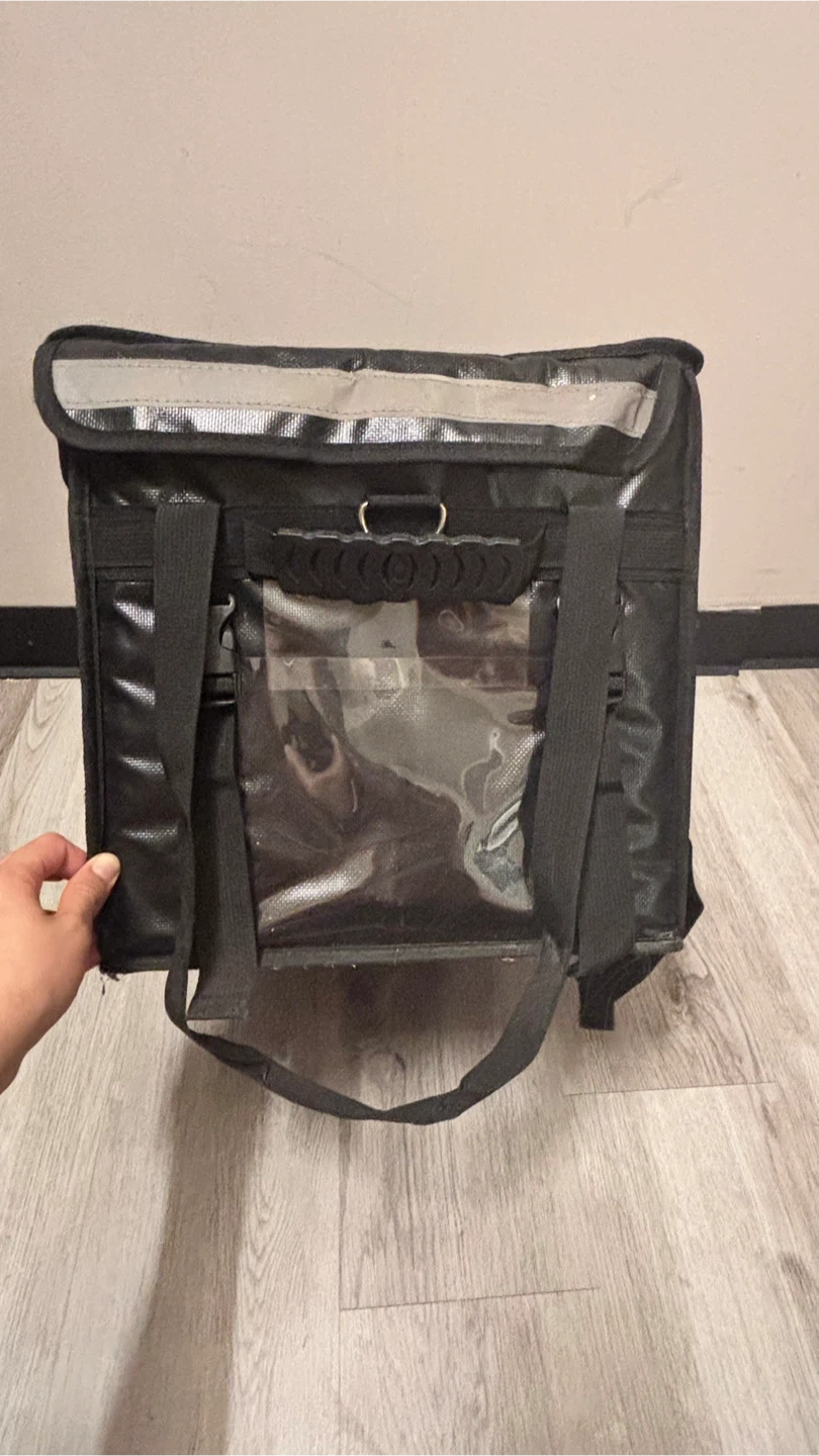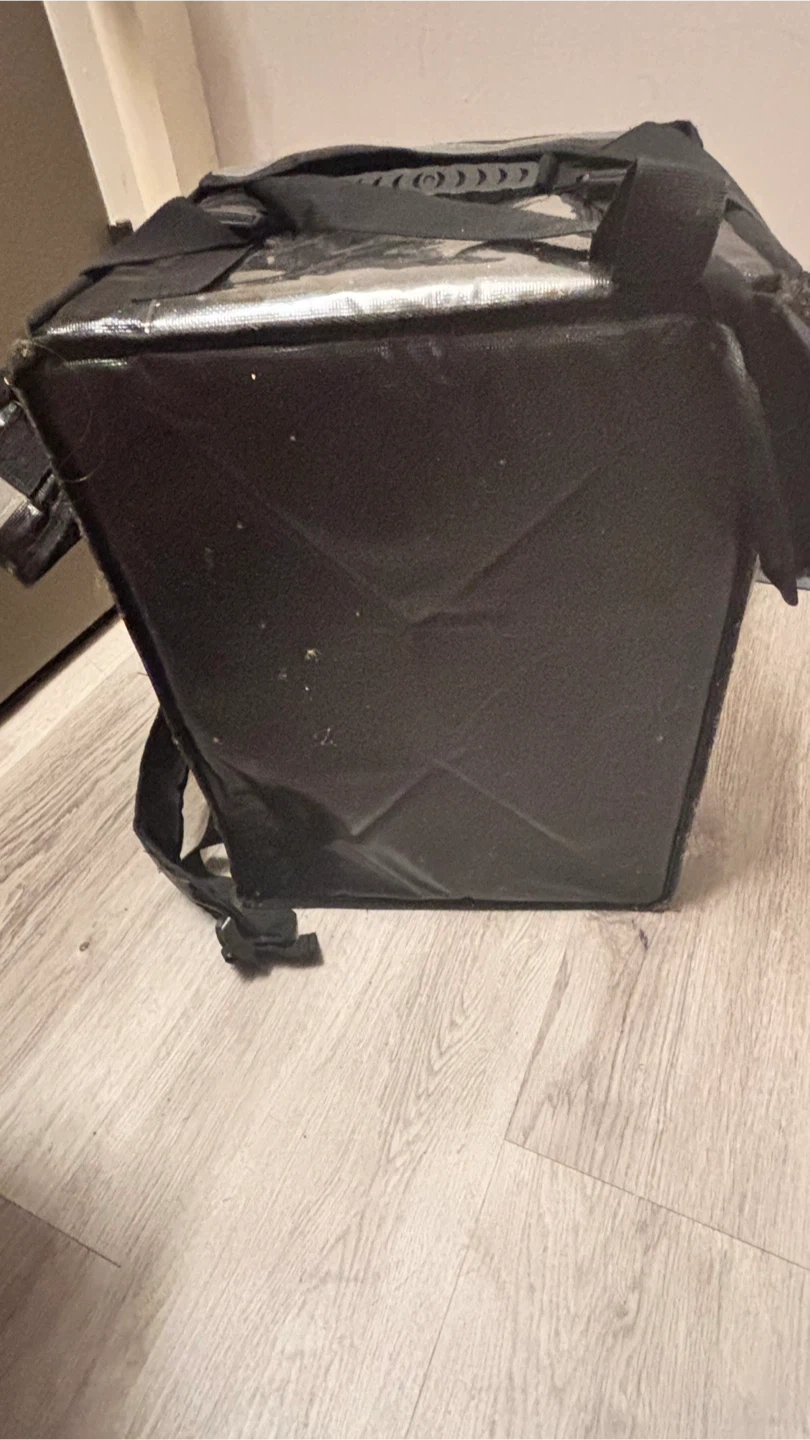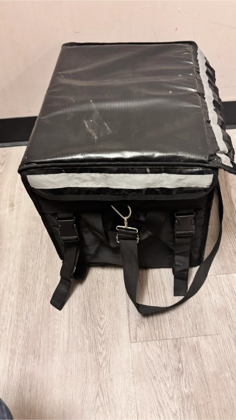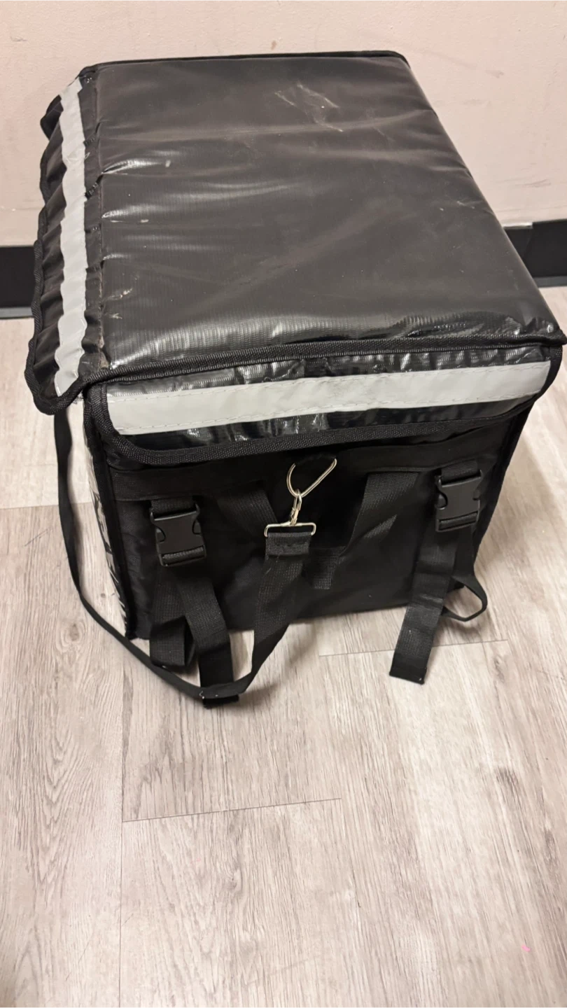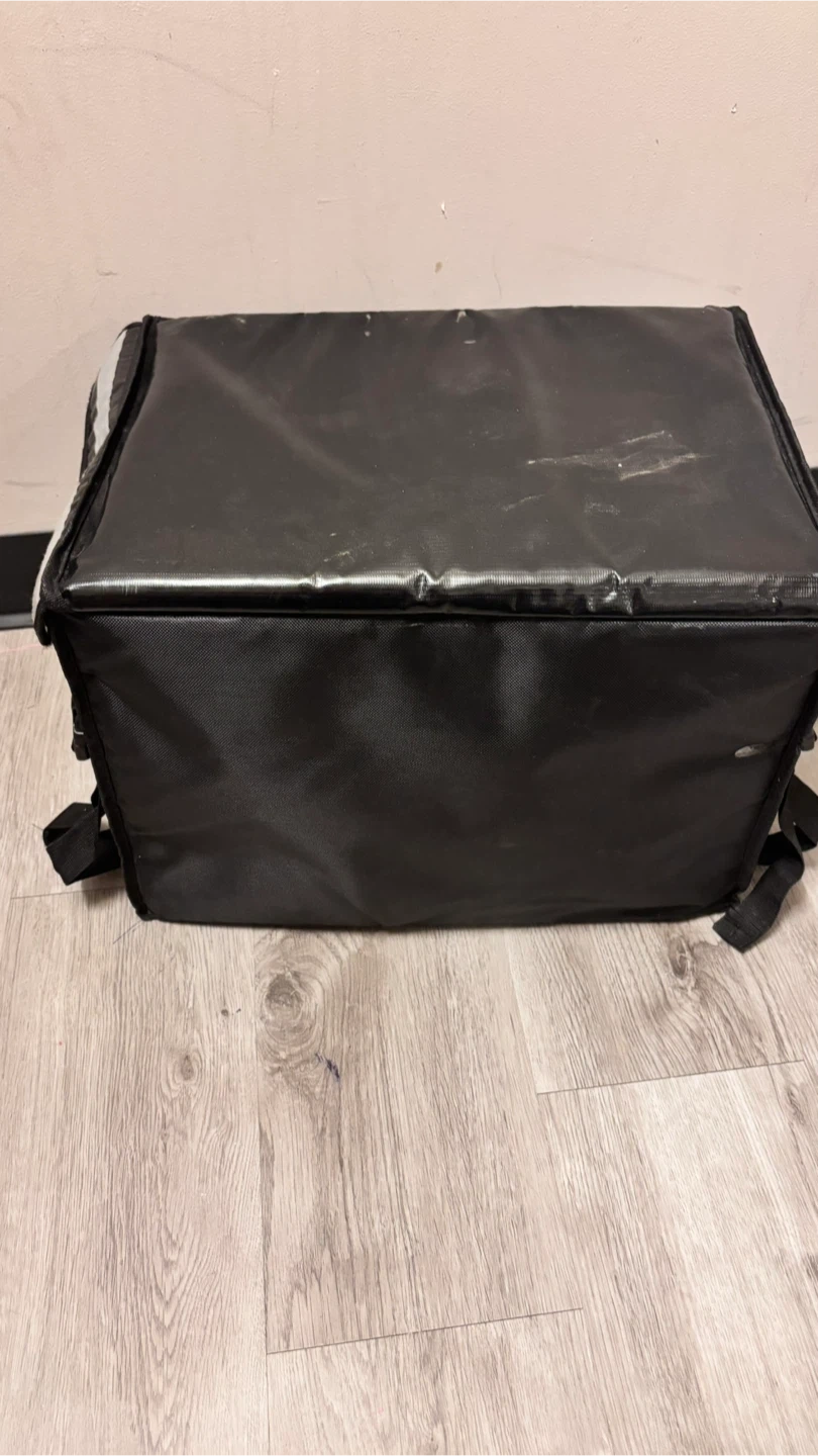 Selling a used delivery backpack. It's an insulated food warmer bag, perfect for keeping food hot or cold on the go. It has some signs of use, but it's still in good working condition.