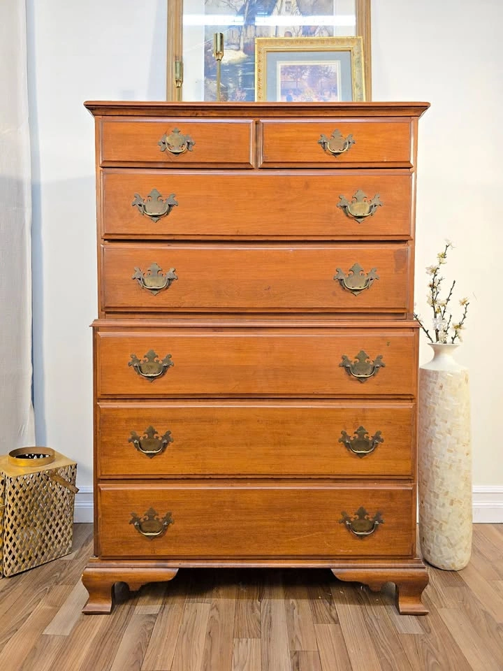 Dimensions: Width: 34" Height: 52" Depth: 20" Pick up is in New Fairfield, CT, 06812 We are focused in selling high quality used furniture! β Quality & Care β All furniture is carefully inspected for mold and lead β safety is our priority β Drawers and hardware are checked to ensure everything functions smoothly β Interiors are cleaned and waxed, so your dresser arrives fresh, smooth, and ready to enjoy π§‘ Our Mission We believe everyone β and everything β deserves a second chance. Every piece we restore has a history, and weβre here to preserve its story and help it find a new home. β»οΈ Support sustainability by choosing thoughtfully refinished furniture built to last. Feel free to message if you have any questions!
