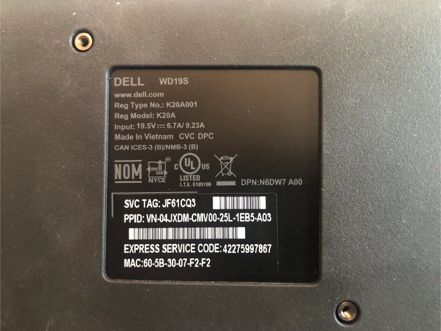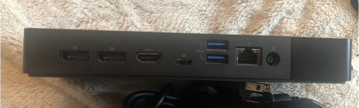 21Dell Docking Station WD19S Used with Dell Latitude 5240 Connects to Laptop with USB 3.2 Gen2 Type-C Video Ports * USB 3.2 Gen2 Type-C with HDMI2.0 x1 * DisplayPort++ 1.4 x2 Network Port * Gigabit Ethernet (RJ-45) x1 USB Ports * Front USB 3.2 Gen1 x1: Dell PowerShare BC1.2; 2 A @ 5 V (max 10 W) * Front USB 3.2 Gen2 Type-C: 1.5 A @ 5 V (max 7.5 W) * Rear USB 3.2 Gen1 x2: 0.9 A @ 5 V (max 4.5 W) * Rear USB 3.2 Gen2 Type-C with DisplayPort 1.4 x1: * 3 A @ 5 V (max 15 W) Dimensions (not including cords) * 205 mm x 90 mm x 29 mm Comes with power cord to outlet and cord to laptop (USB-C) Support/Manual https://www.dell.com/support/manuals/en-us/dell-wd19s-130w-dock/wd19s_user_guide/docking-specifications