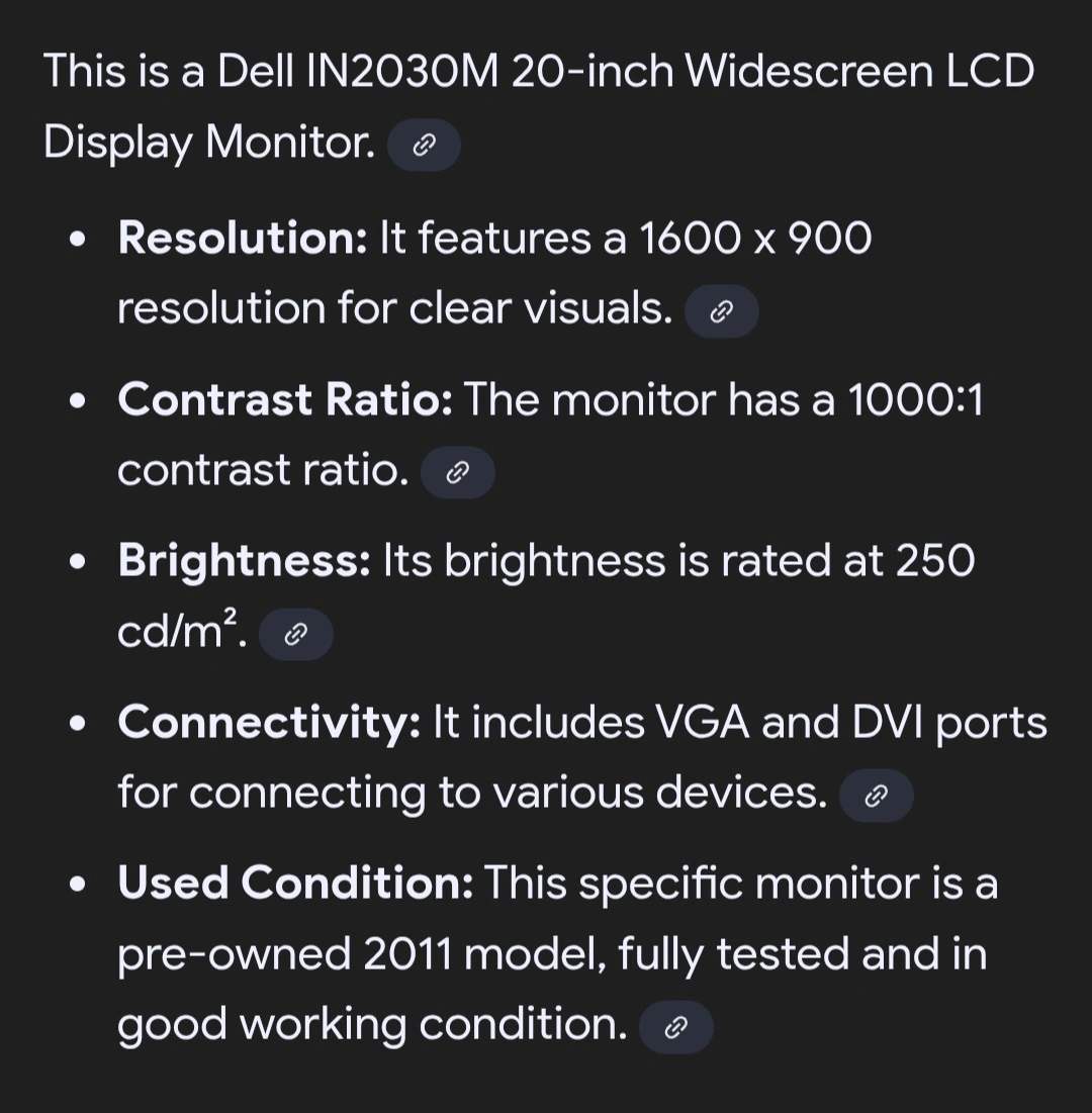 Selling a Dell IN2030M 20-inch Widescreen LCD. This monitor is in excellent condition. No power cable. Just monitor. All info for this monitor is in pictures.