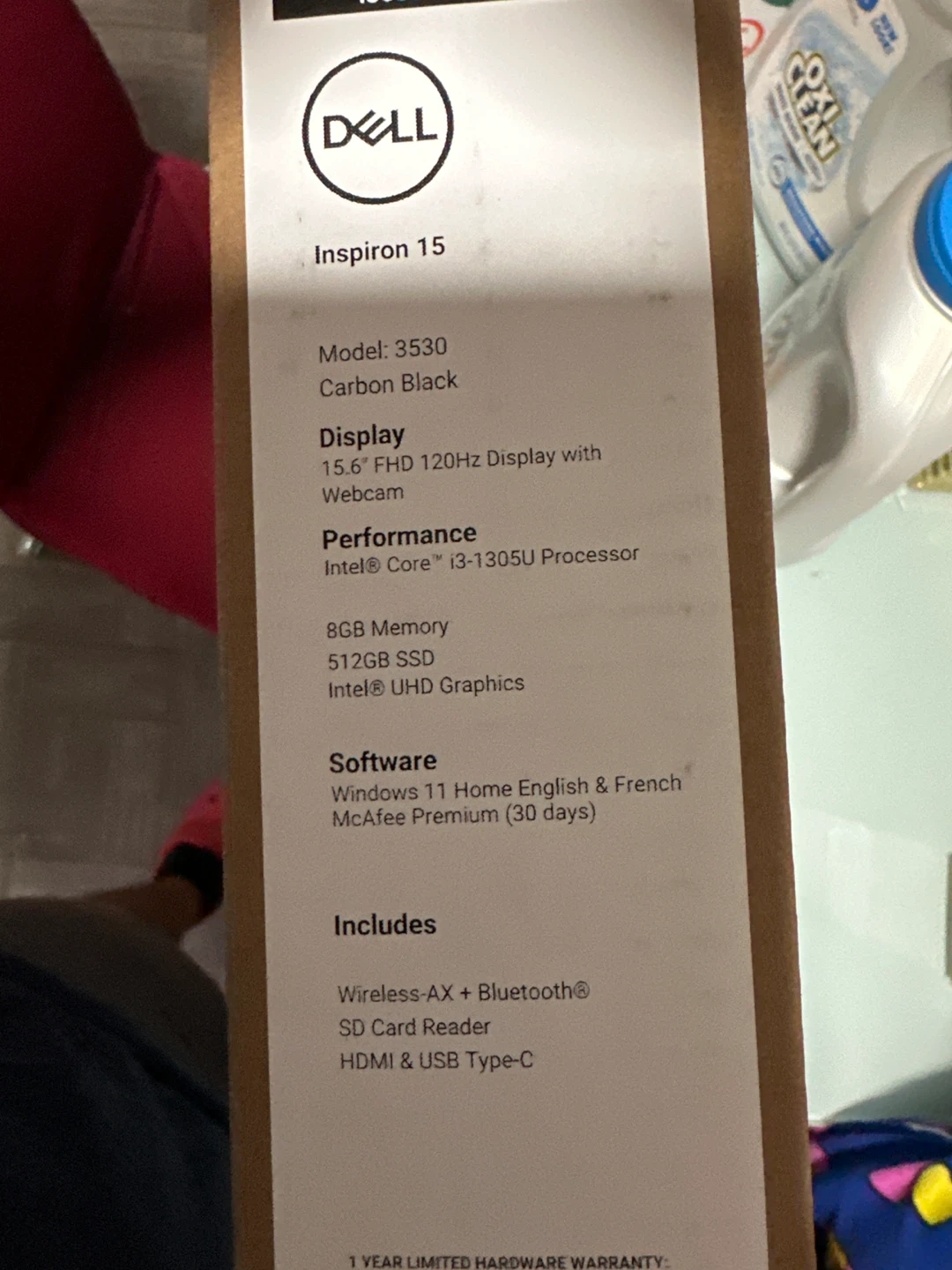 67Selling a Dell Inspiron 15 3530 laptop in Carbon Black. It features a 15.6" FHD 120Hz display with a webcam, an Intel Core i3-1305U Processor, 8GB of memory, and a 512GB SSD. It also includes Wireless-AX + Bluetooth, an SD Card Reader, and HDMI & USB Type-C ports. Comes with Windows 11 Home English & French.