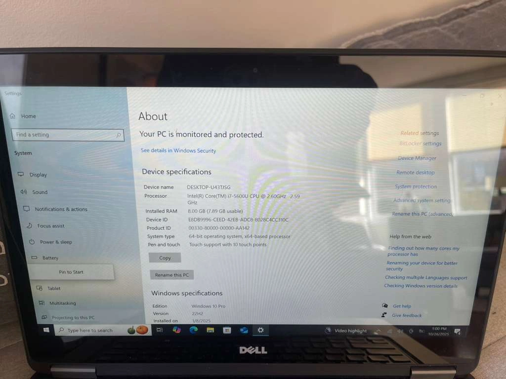 20Processor: Intel (R) Core (TM) i&-5600U @2.60GHz 2.59 GHz Installed RAM: 8.00GB (7.89 Usable) System type: 64-bit operating system Pen and Touch- Touch Support with 10 touch points Might need a battery