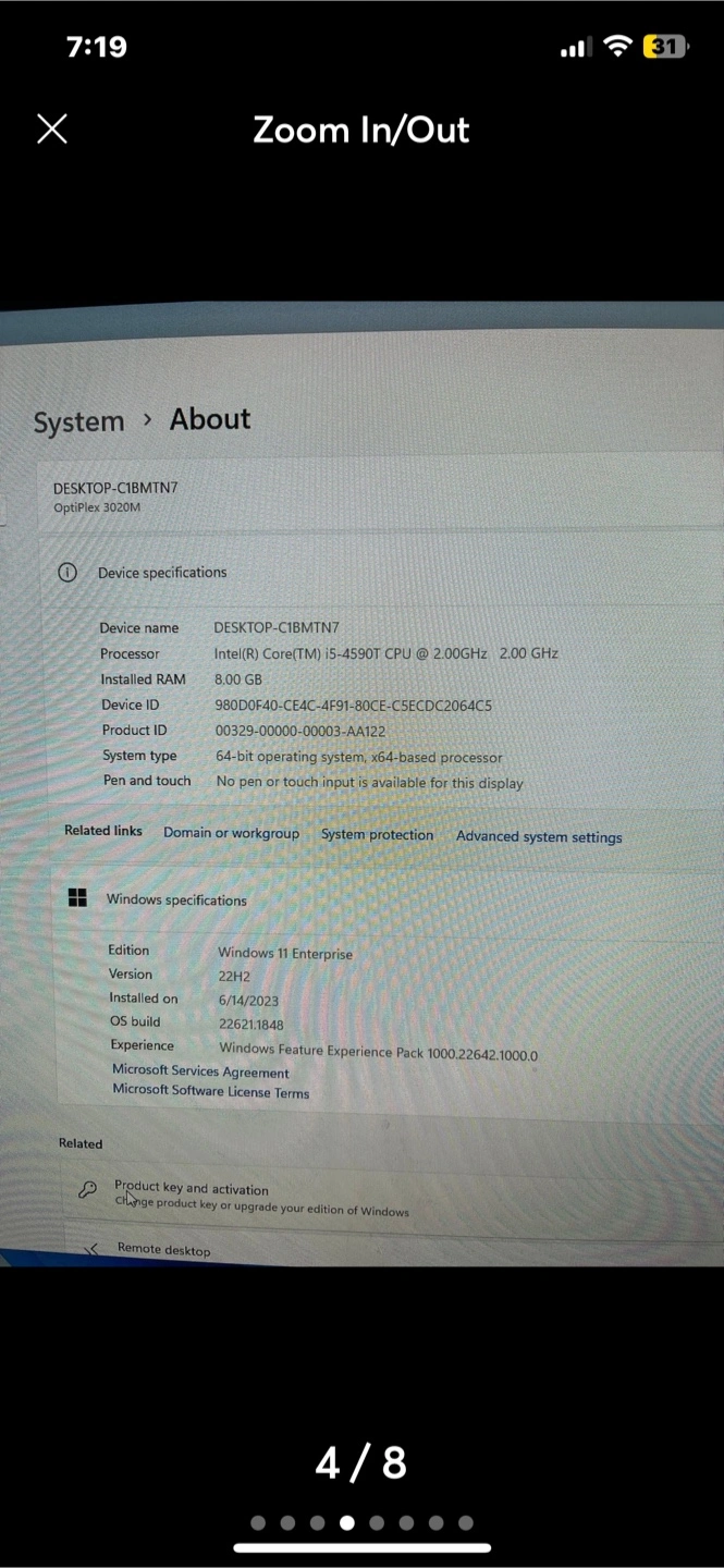 Selling a Dell OptiPlex 3020M desktop PC. It comes with an Intel(R) Core(TM) i5-4590T CPU @ 2.00GHz processor and 8.00 GB of installed RAM. The system type is 64-bit operating system, and it's running Windows 11 Enterprise, version 22H2.
