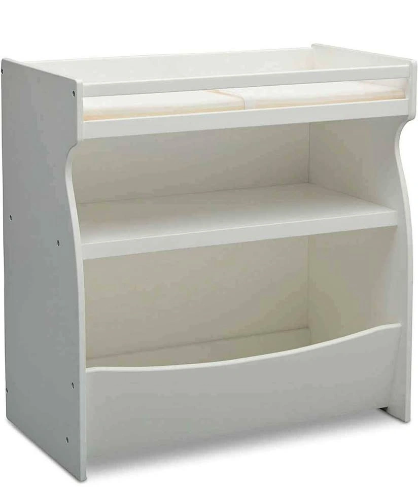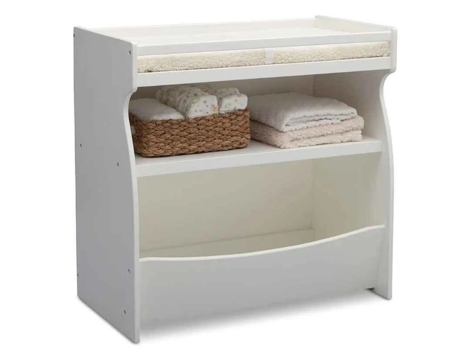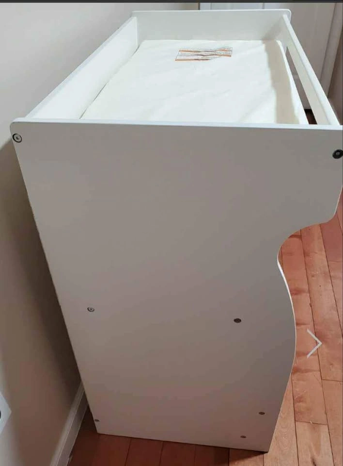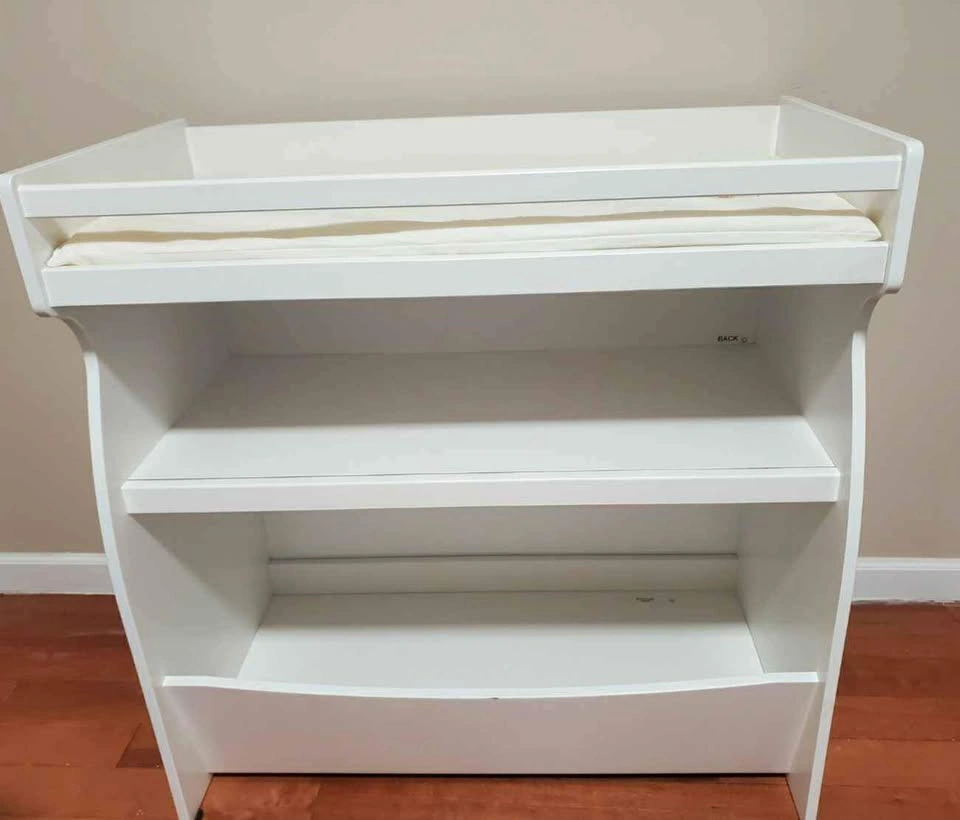 With changing pad 34.25"W x 18.75"D x 35"H Strong & sturdy wood construction Slight scratch on the bottom, not that noticeable. can be fixed markers paint. Changing table includes one fixed shelf and an open storage bin at the bottom Tested for lead and other toxic elements to meet or exceed government and ASTM standards Original price when i got is $273 already assembled. :)