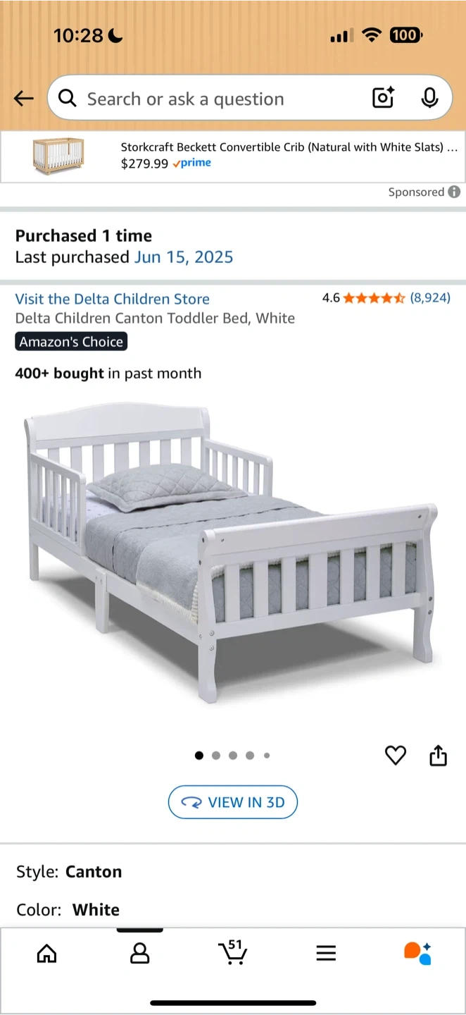 10Selling a Delta Children Canton toddler bed in white! It was last purchased in June 2025. This bed is Amazon's Choice and has been bought 400+ times in the past month