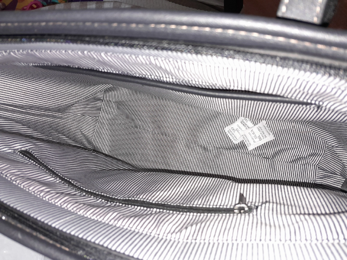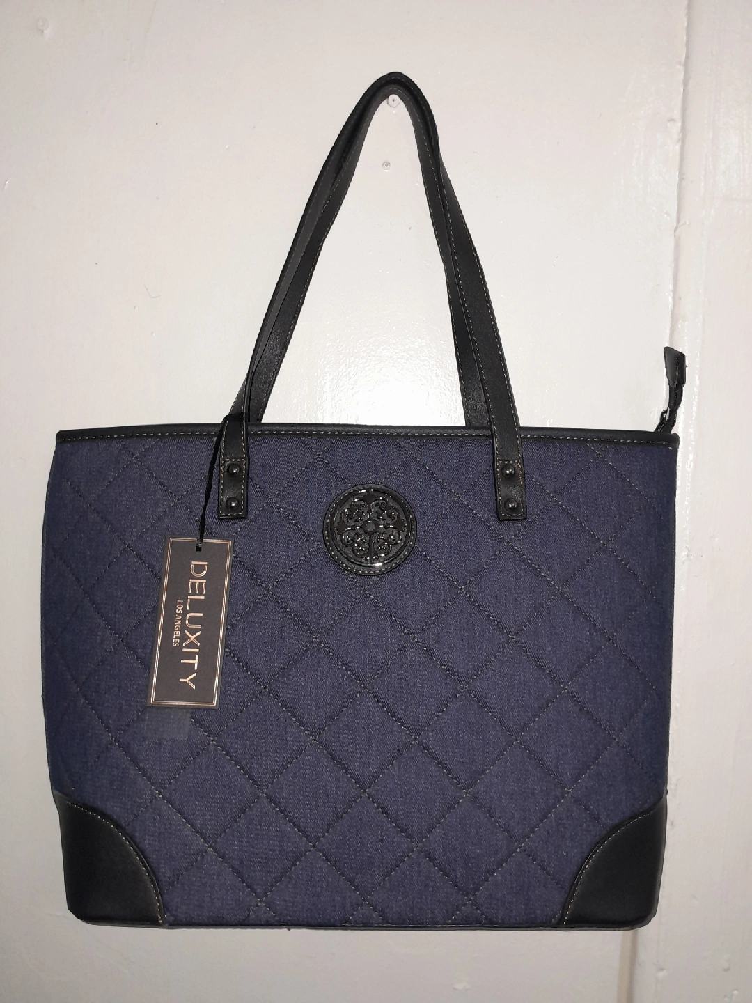 I'm selling a DELUXITY Los Angeles tote bag. It's a stylish and functional bag, perfect for everyday use. The bag features a quilted design and sturdy straps. The interior has a striped lining and a zippered pocket.