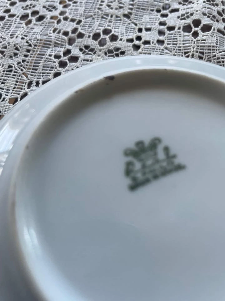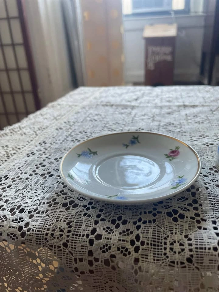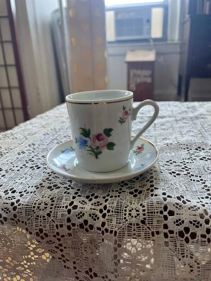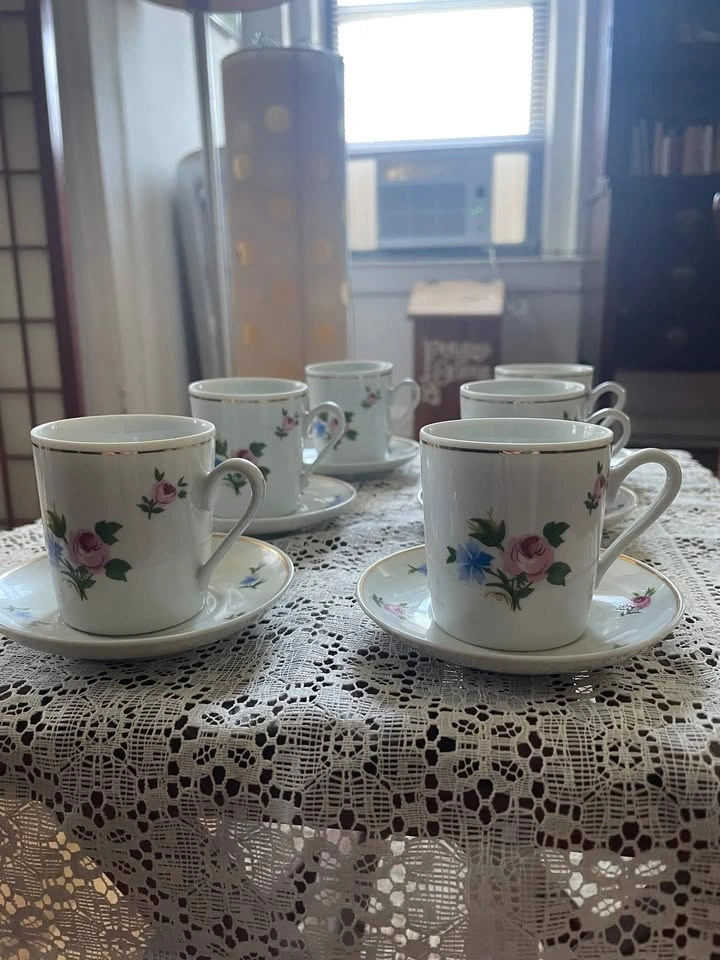 Pretty demitasse cups and saucers from Brazil. White with floral design and gold trim. From the 1980s. Set of 6 $18 for all