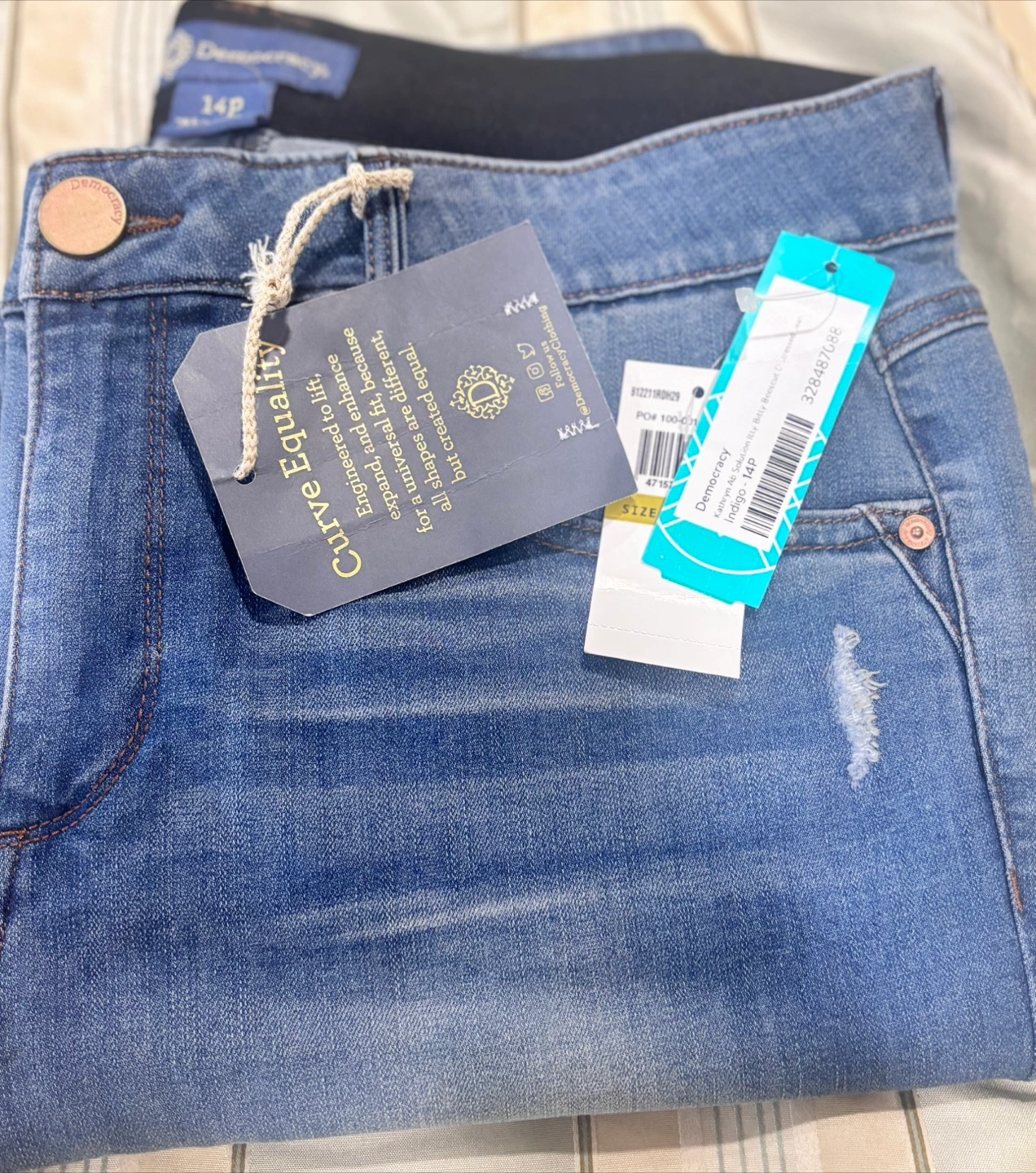 47I'm selling a pair of Democracy "Ab" Solution Itty Bitty Boot jeans. These are a stylish bootcut style in a blue wash. They're designed to "Mold & Hold" and new with tags!
