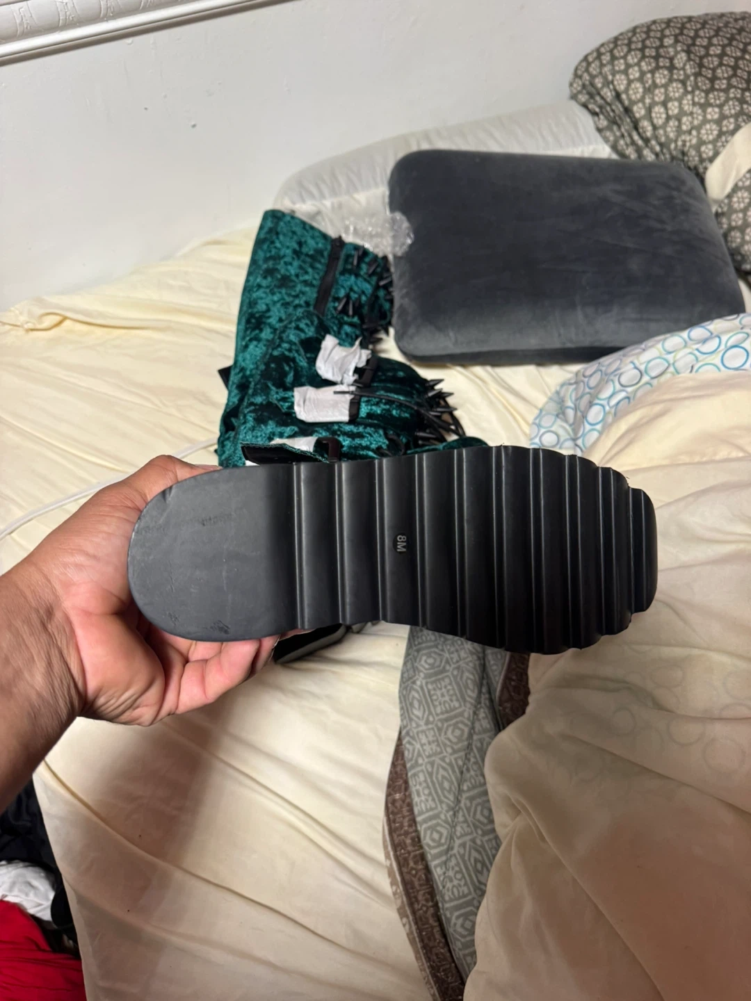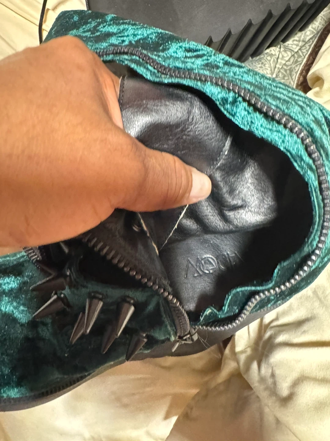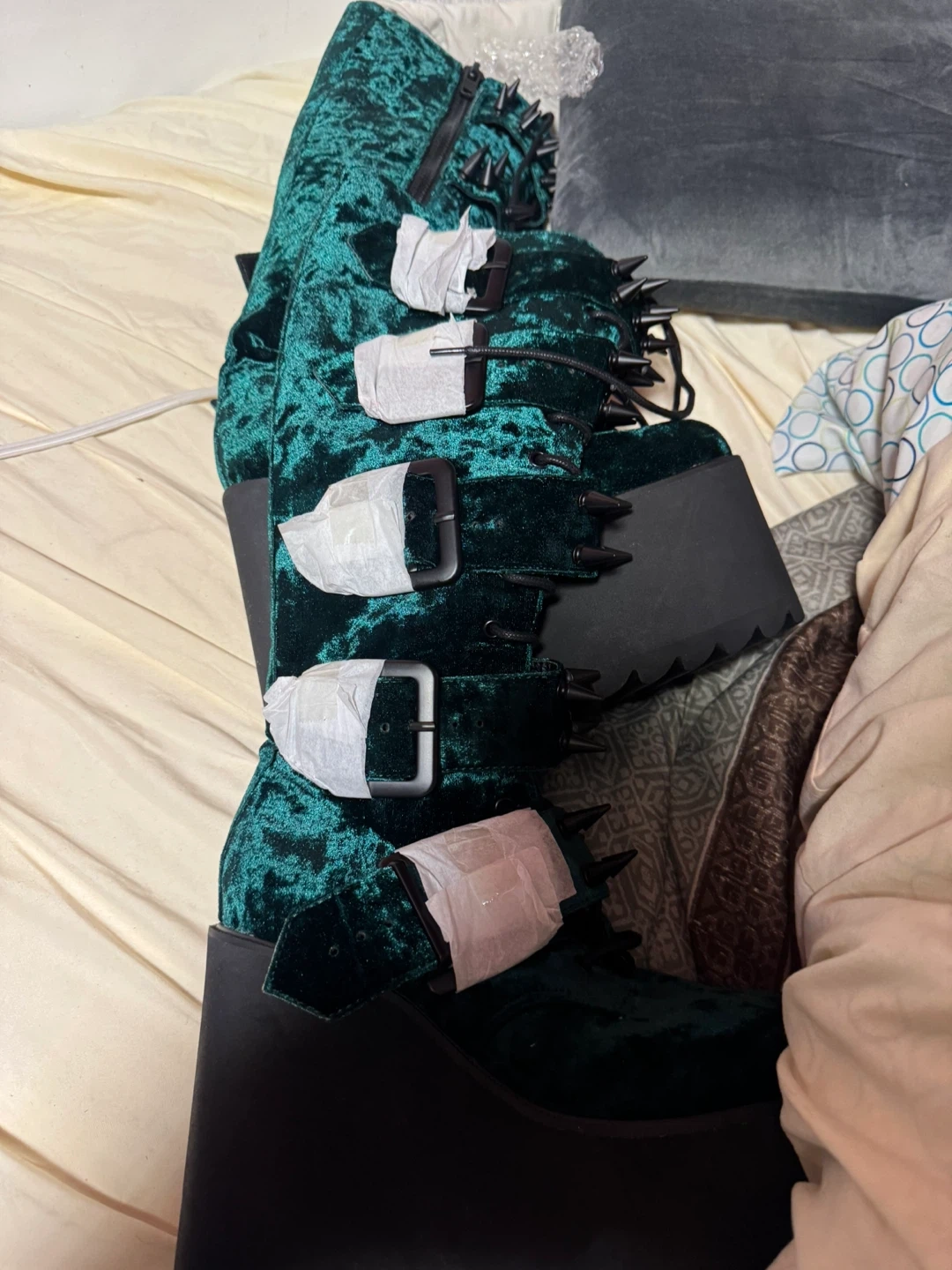 25Selling a pair of Demonia Stack-301 platform boots in a striking green velvet! These boots are a size 8 and feature a unique design with spikes and buckle straps. Perfect for adding a bold touch to any outfit!