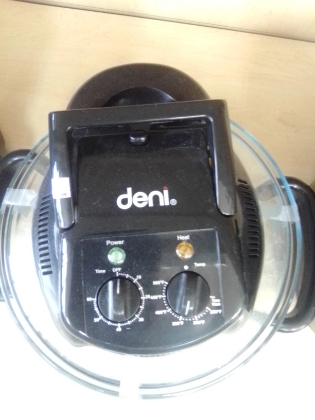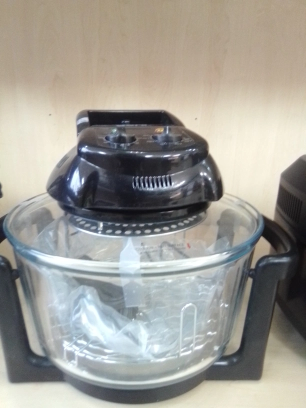 Black air fryer with glass bowl and a rack. Includes timer, temperature control, and power switch. Layaway and in house financing available open Mon-Fri. 10am-6pm Sat 10am-5pm sunday-closed 2337 w cermak ASK FOR IARELY