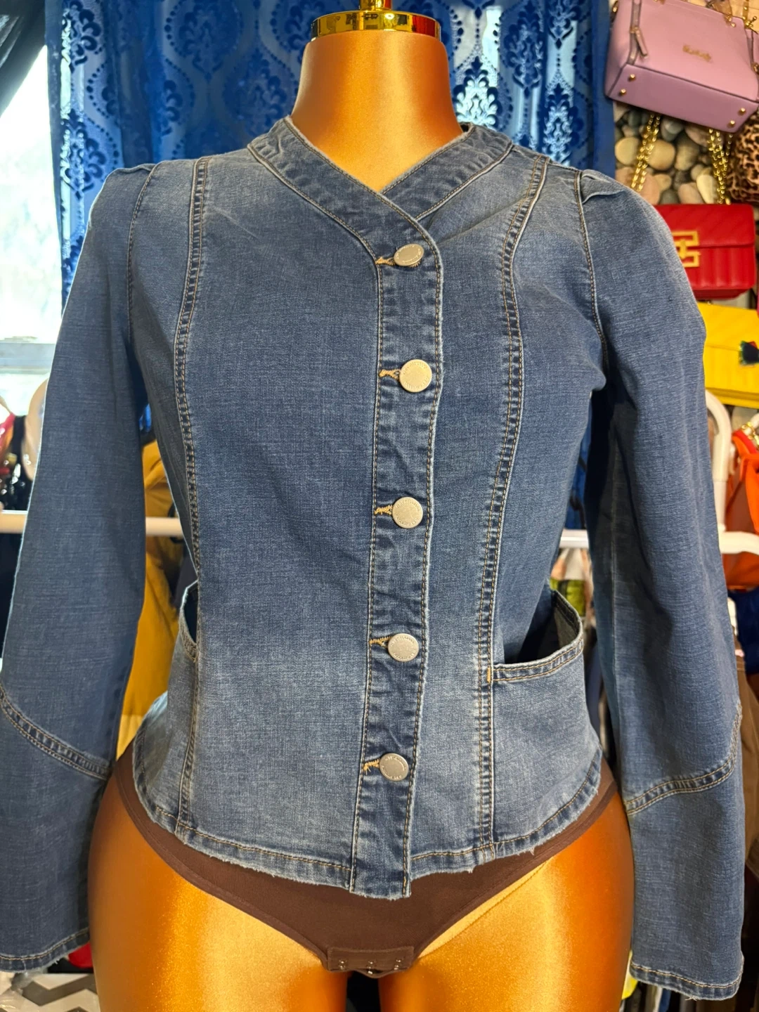 Here's a cute denim jean jacket! It has a unique design with buttons down the front and a stylish collar. Perfect for layering or wearing on its own