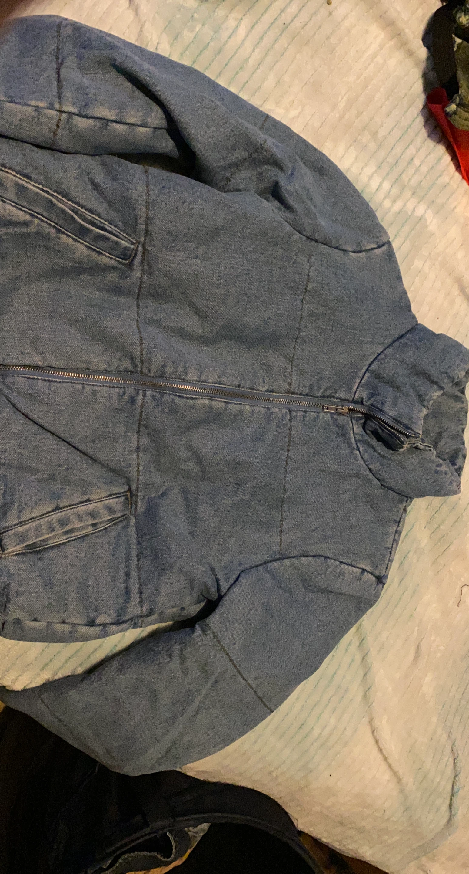 Here's a denim puffer jacket, perfect for cooler weather! It's in good condition and ready for a new home