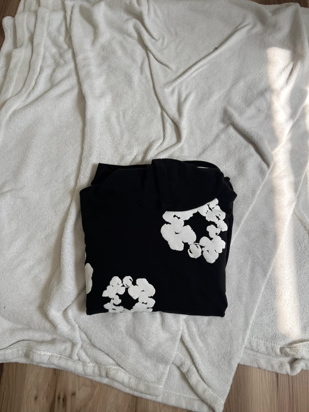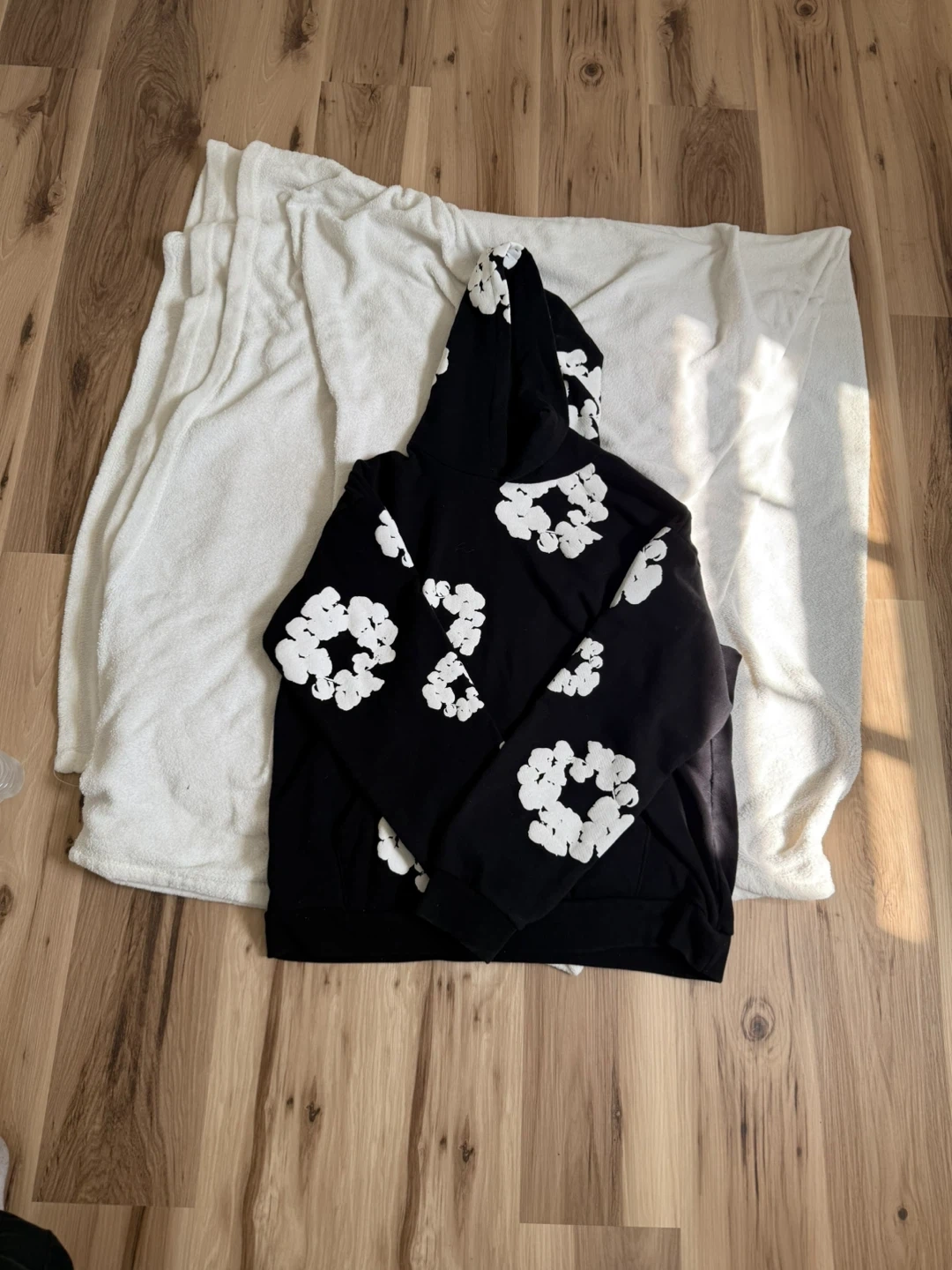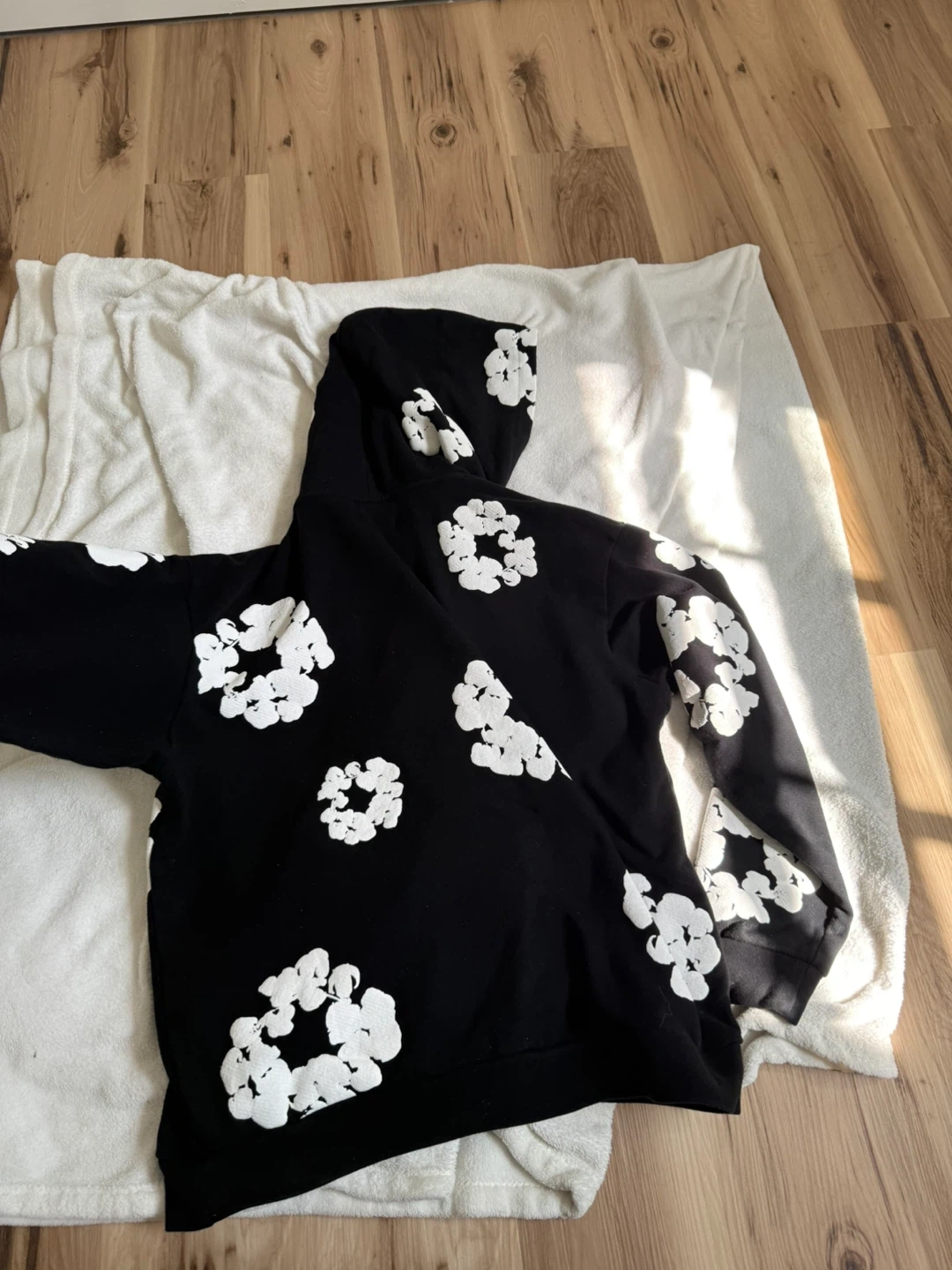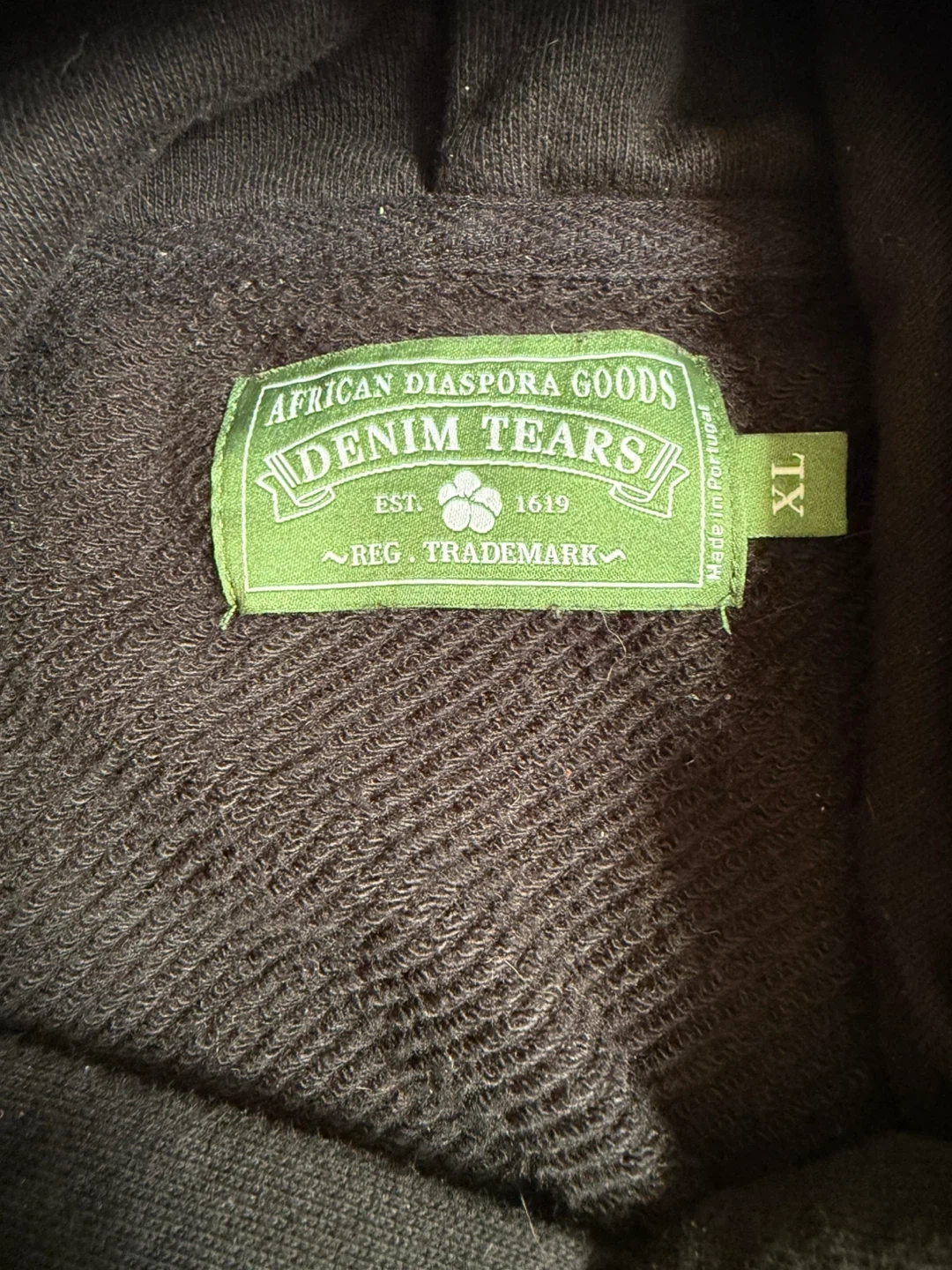 Selling a Denim Tears hoodie in size XL. It's black with a white floral design. The tag indicates it's part of the African Diaspora Goods collection. Feel free to reach out if you're interested!