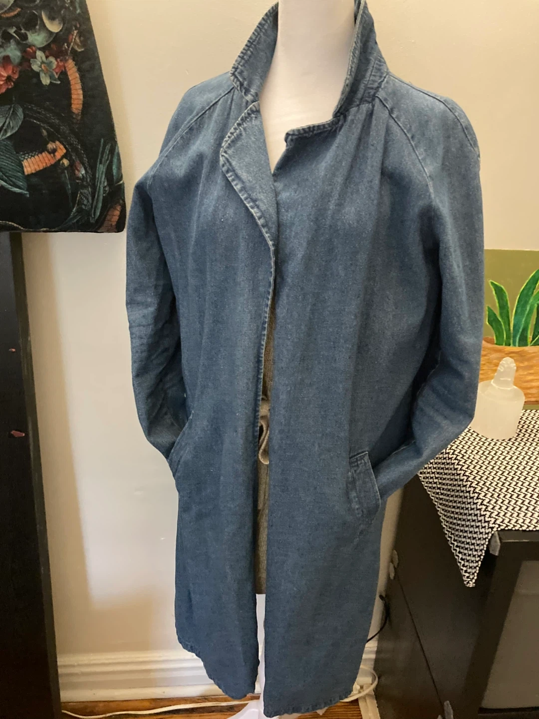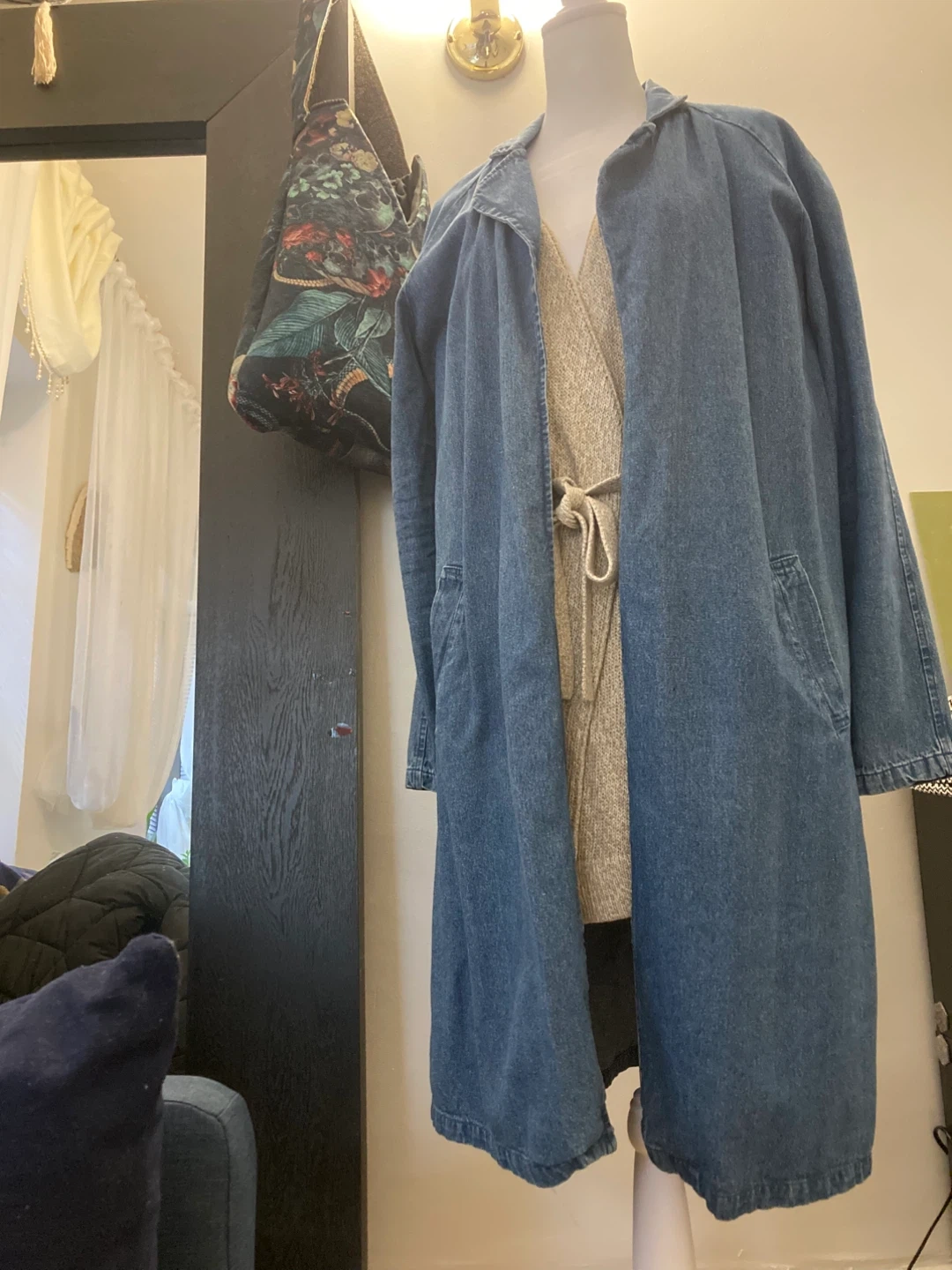 27Here's a stylish denim trench coat! It's a classic piece that can be dressed up or down. Perfect for layering during transitional weather