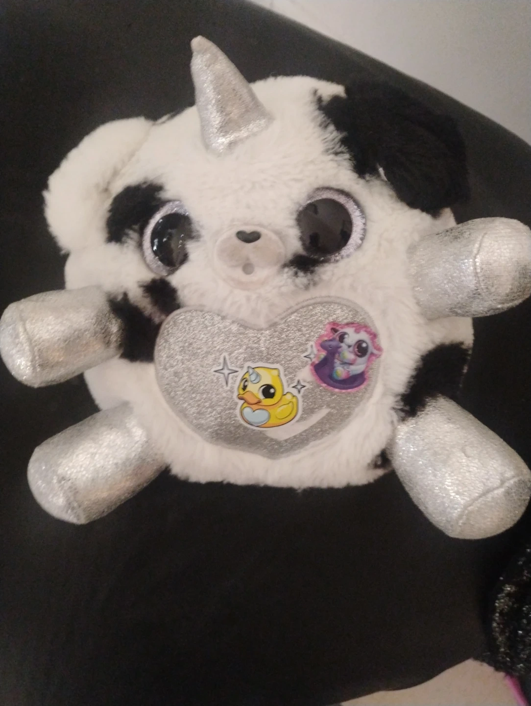 This is a soft plush stuffed animal toy. It's black and white with silver accents and a unicorn horn. It features a sparkly heart on its chest with cute character appliques.