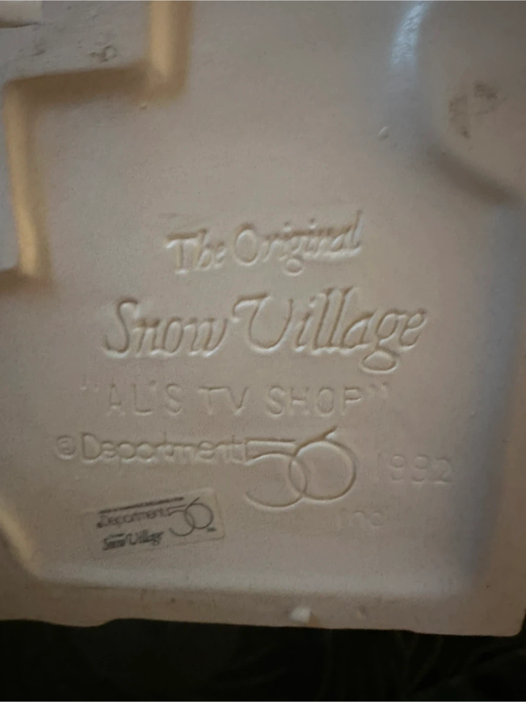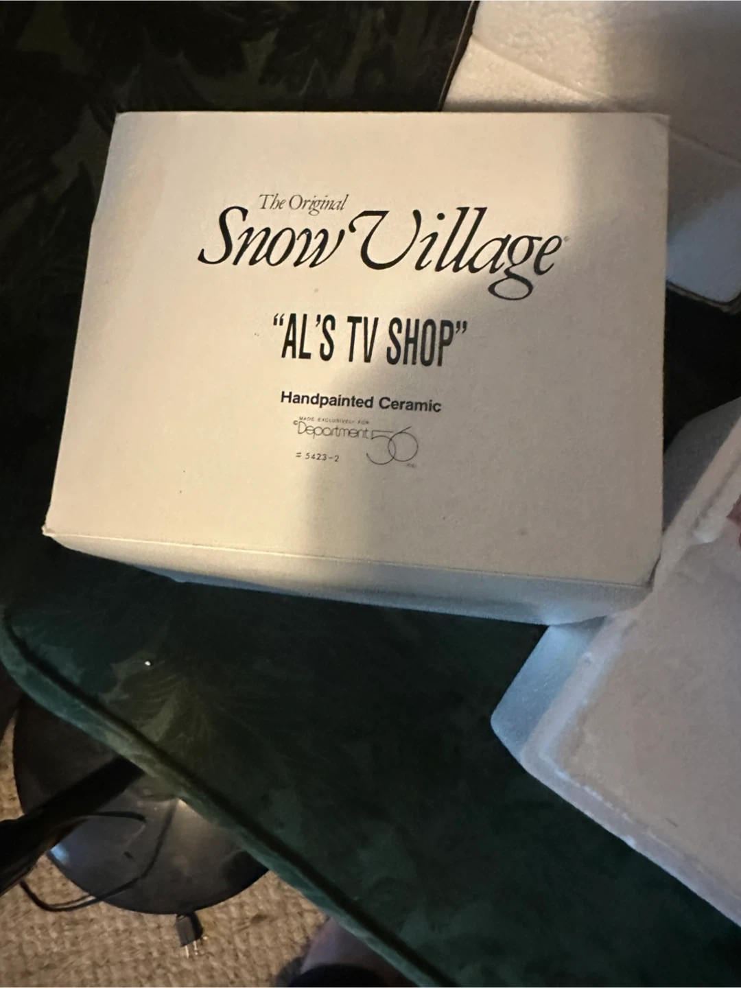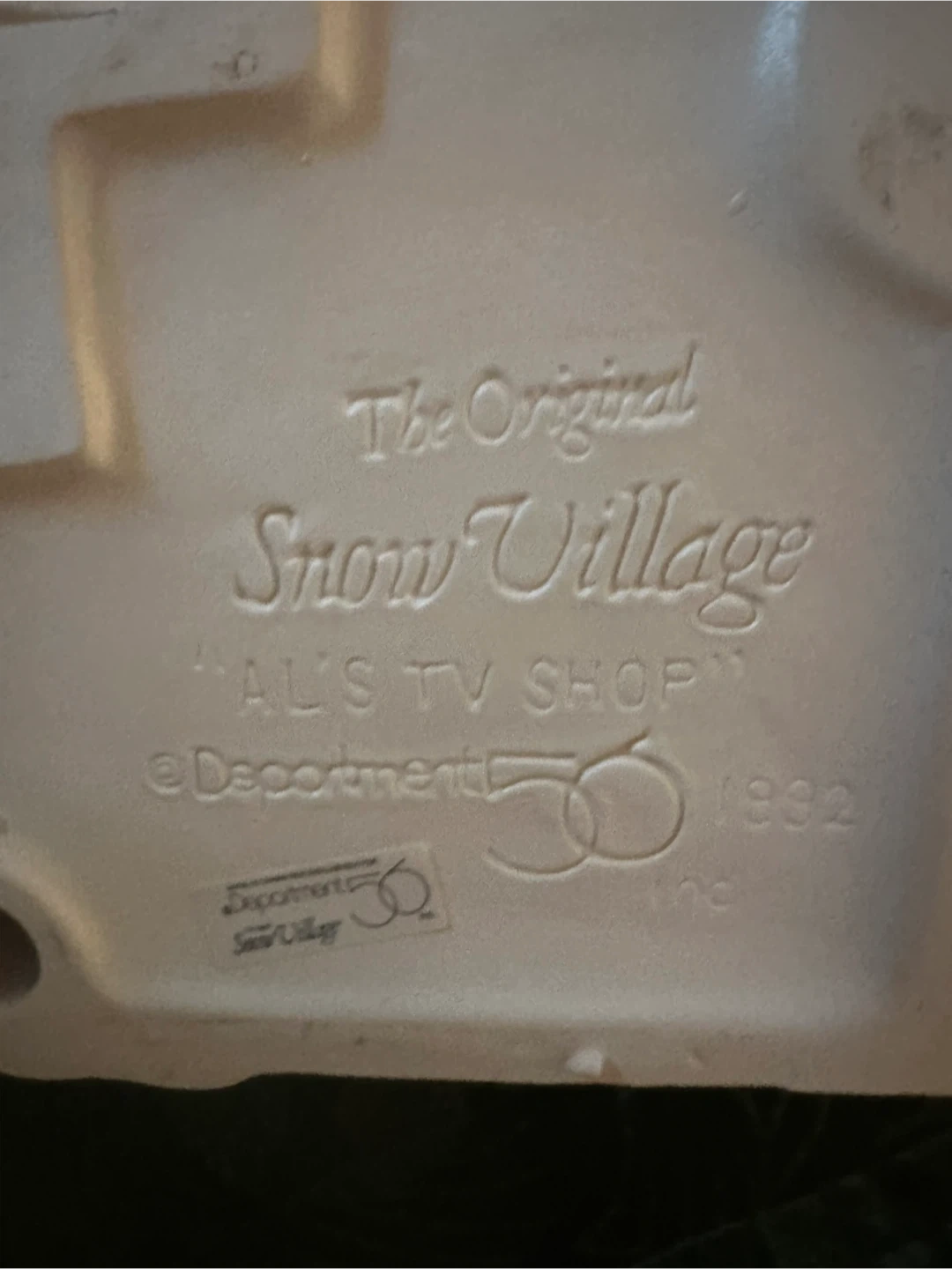 60Selling a Department 56 The Original Snow Village piece, "Al's TV Shop"! This charming collectible building is part of the Snow Village series and comes with its original box. It's a delightful addition to any holiday village display or Department 56 collection