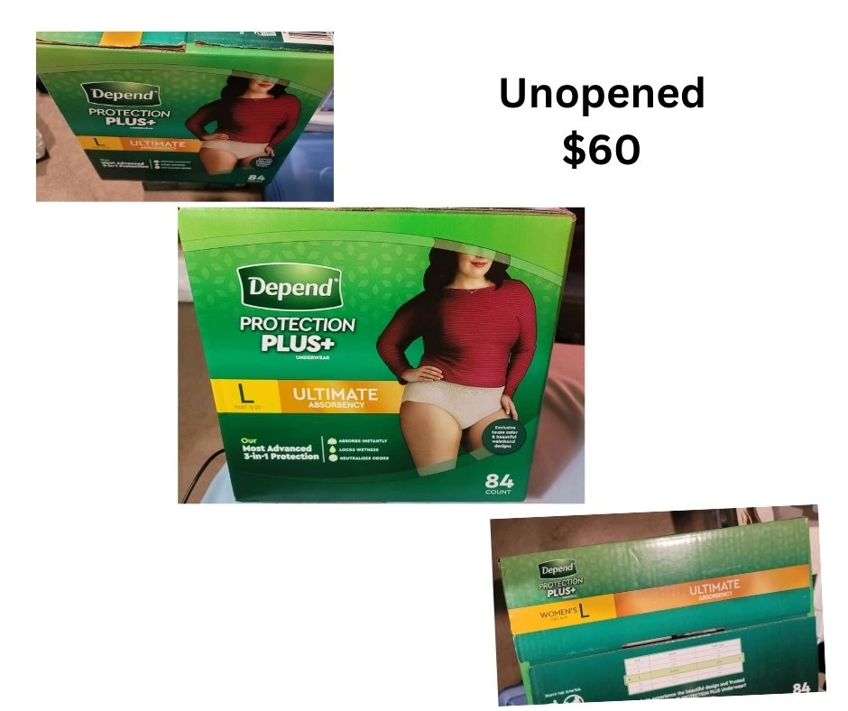 Selling a new, unopened box of Depend Protection Plus+ underwear in size L. This is the Ultimate Absorbency version, offering advanced 3-in-1 protection. The box contains 84 count