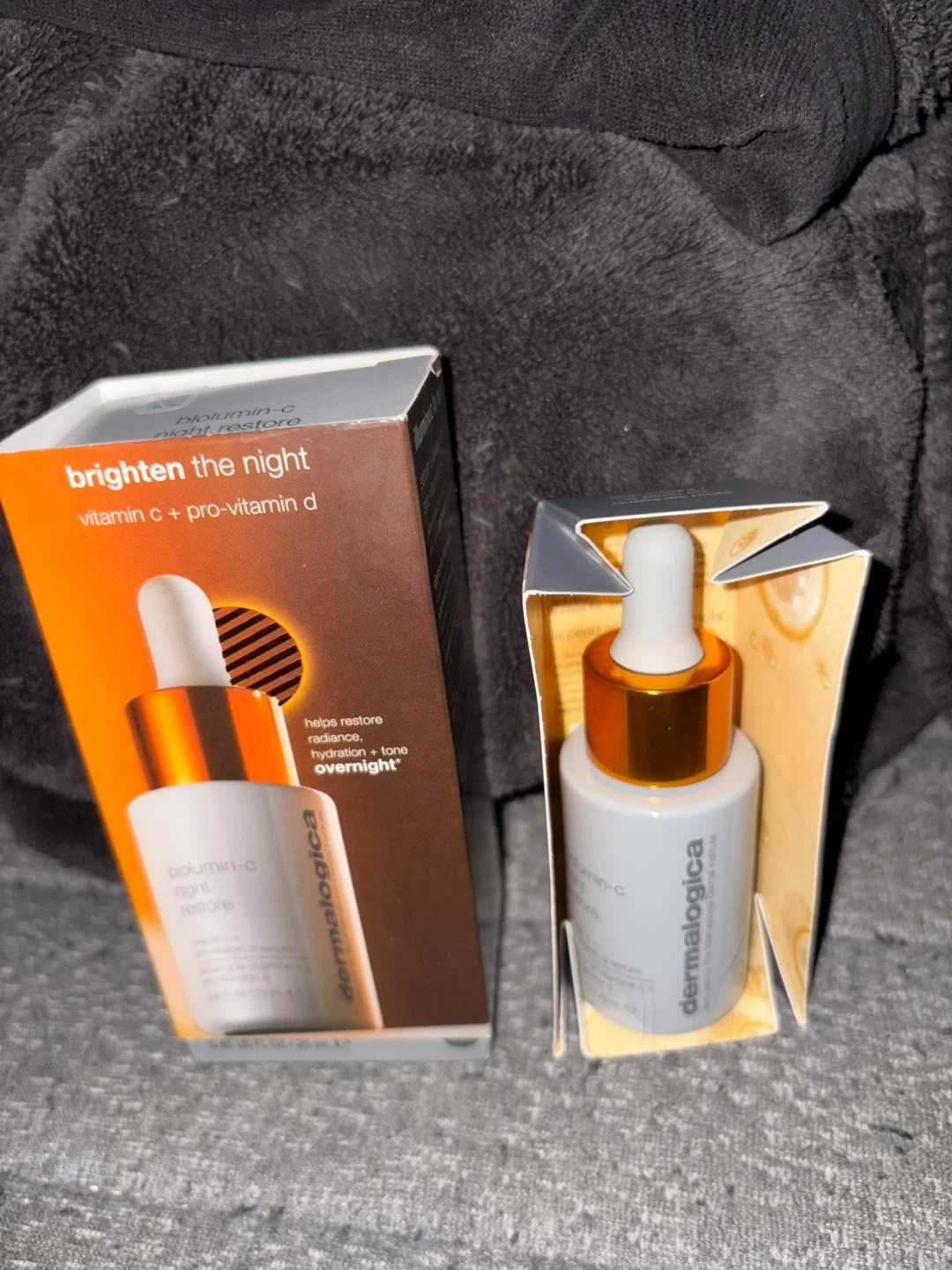 10Selling a Dermalogica Biolumin-C Night Restore serum! This overnight serum is designed to brighten the night and help restore hydration and tone. It contains vitamin C and pro-vitamin D. It helps restore overnight. Get yours today! 25 Ml