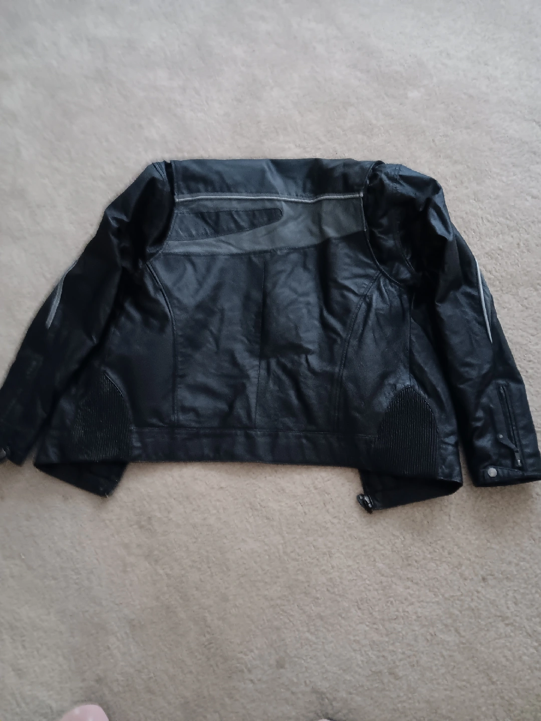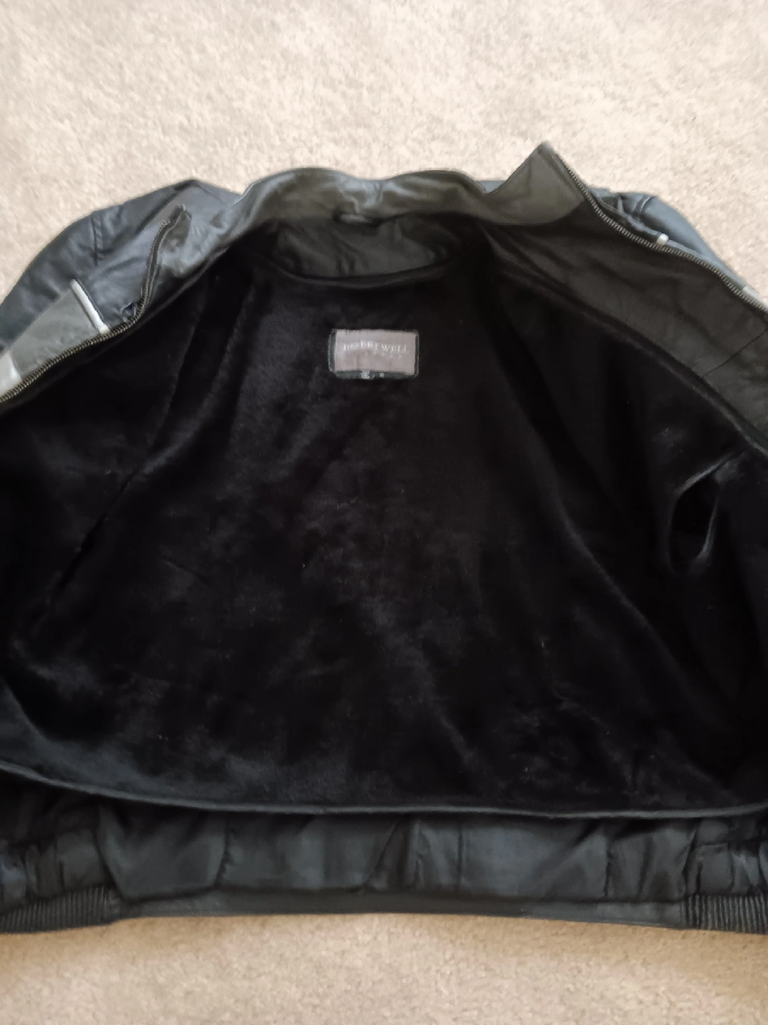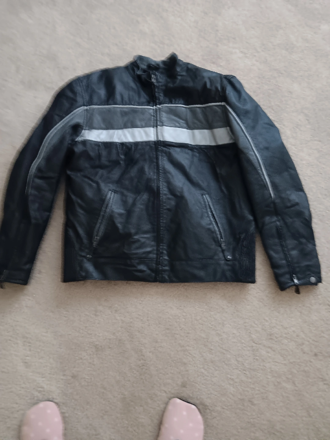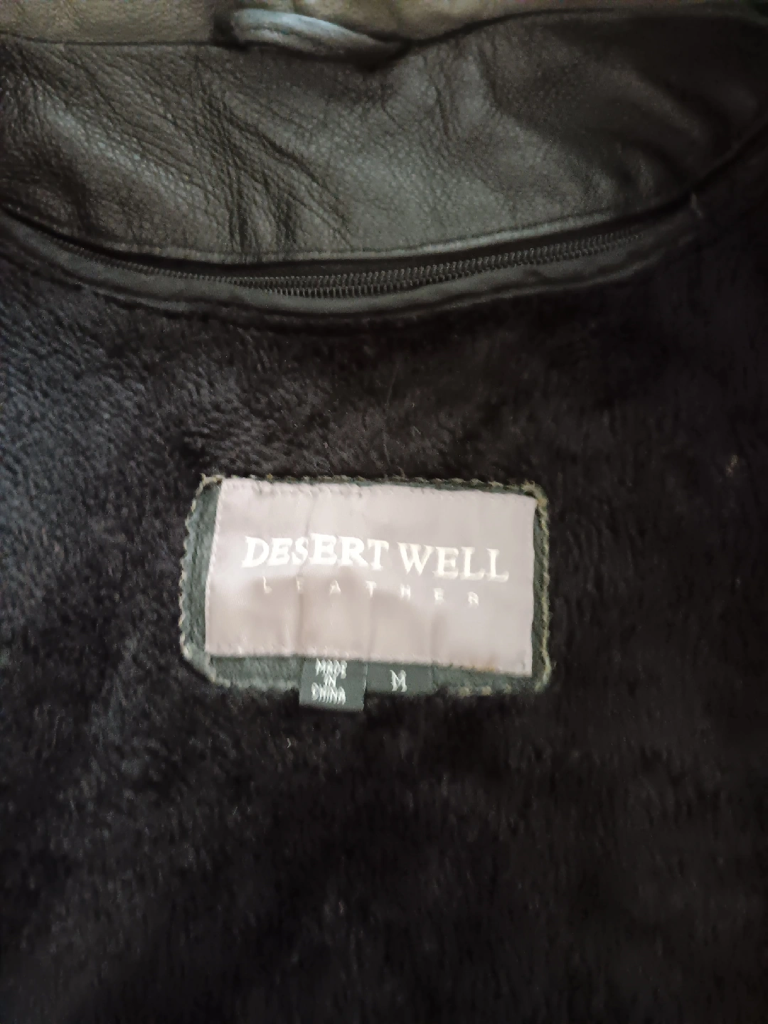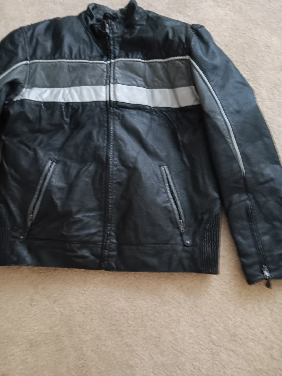 10Selling a Desert Well leather jacket in size M. It's black with gray and white stripes on the front and back. The inside is lined with a soft, black material.bikers jacket,excellent condition.