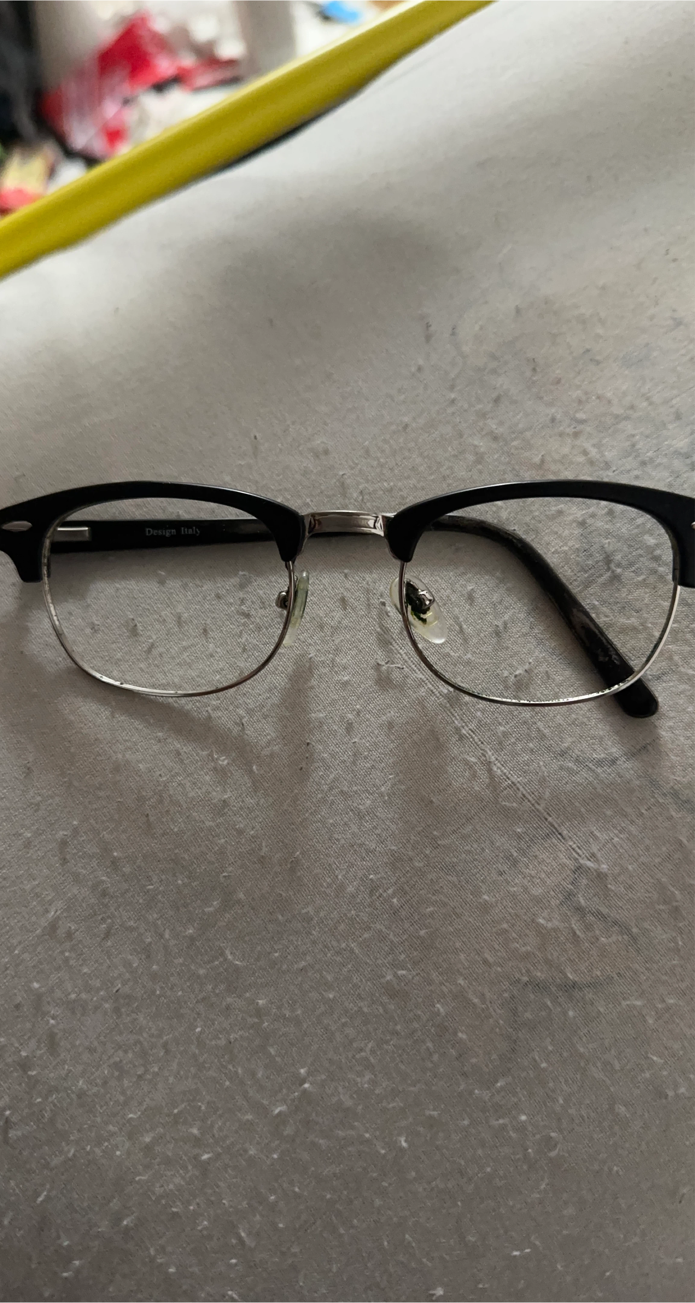 Selling a pair of glasses with a black frame from Design Italy. They are half lenses is broken and other half there is lenses but with no frames degree if you want to fix you can buy from me