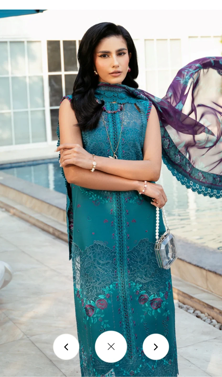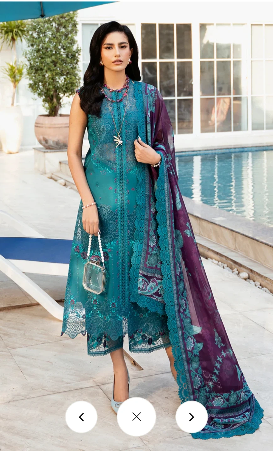 Beautiful designer lawn suit in a lovely turquoise and purple color combination. The intricate detailing and elegant design make it perfect for special occasions or everyday wear. The suit features a stylish cut and comfortable fabric, ensuring a flattering fit and all-day comfort Shirt and trousers lawn cotton Dupatta silk