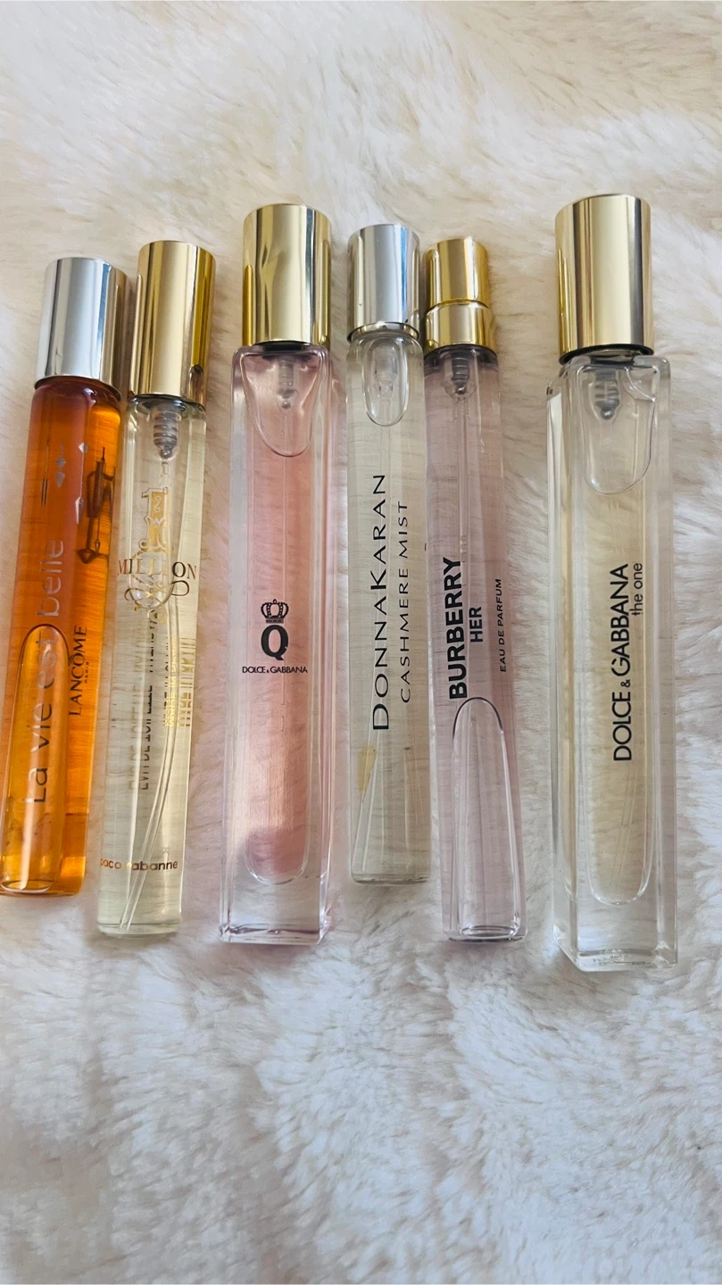 70Selling a set of designer perfume samples. Includes: - Lancome La Vie Est Belle - Paco Rabanne 1 Million - Dolce & Gabbana - Donna Karan Cashmere Mist - Burberry Her Eau de Parfum - Dolce & Gabbana The One $15 each