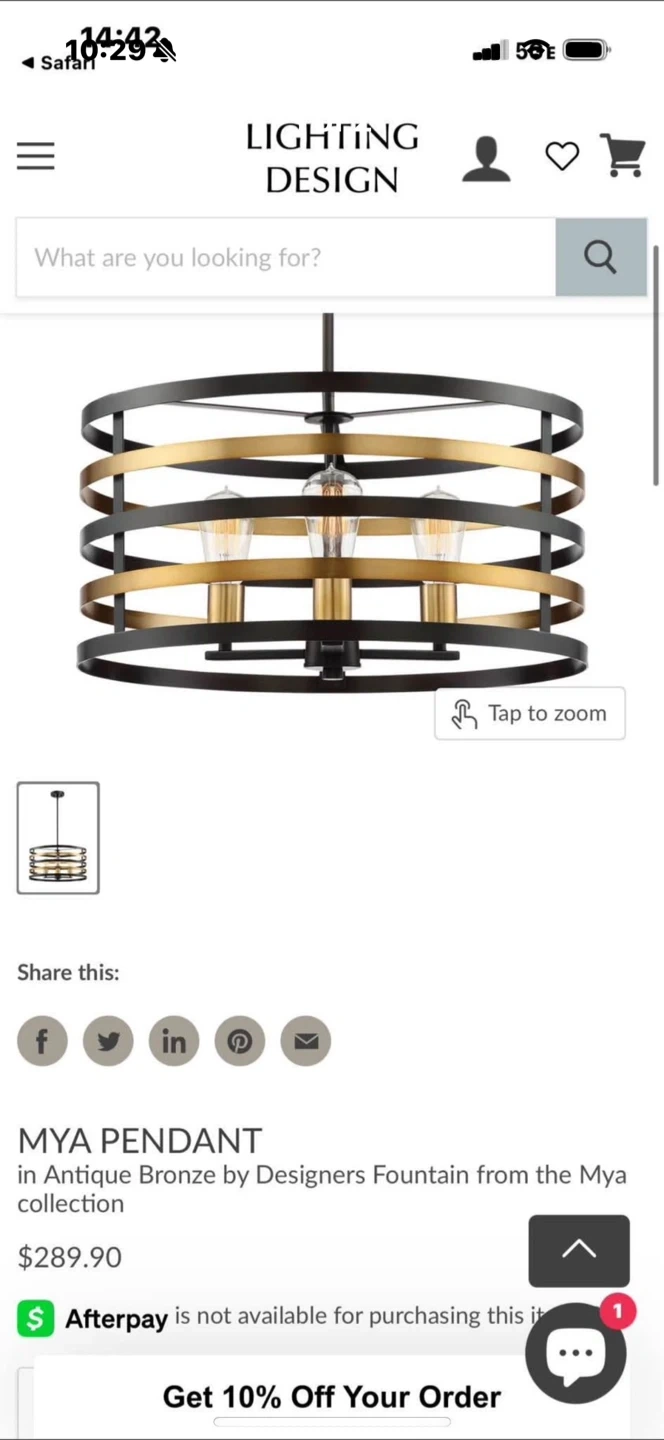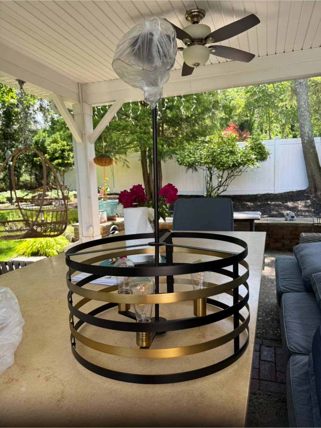 Selling a Designers Fountain Mya Pendant light in antique bronze. It features a stylish design with black and gold accents. Originally bought for $289.90.