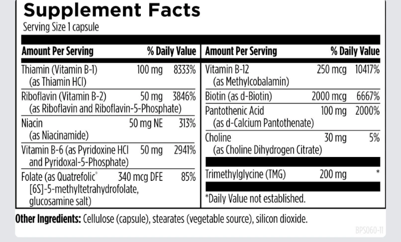 I'm selling Designs for Health B-Supreme Coenzymated B Vitamin Complex, a dietary supplement for professional use only. Each bottle contains 60 vegetarian capsules. The supplement facts are listed on the label, including Thiamin, Riboflavin, Niacin, Vitamin B-6, Folate, Vitamin B-12, Biotin, Pantothenic Acid, Choline, and Trimethylglycine. Expiration Date is 2025 December 31