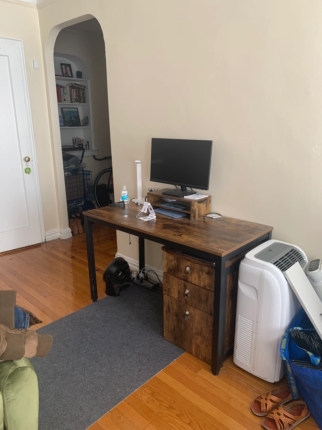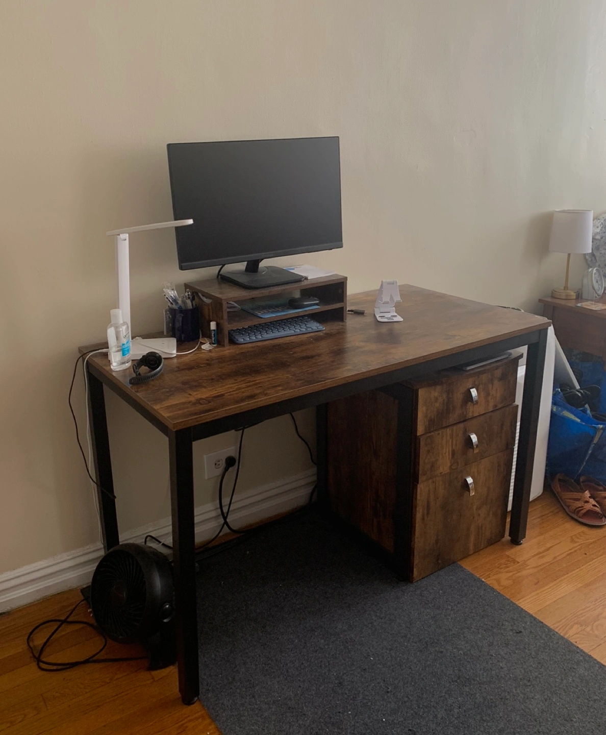 Matching rust brown office desk, filing cabinet and monitor stand for sale as bundle for $20 or each sold separately (DM for individual prices). I’d prefer a bundle. Elevator in building to take down. Description of each and dimensions below. Desk and filing cabinet: both gifted from friends. The desk is in great shape, but too wide for our space; it’s perfect for multiple monitors. The filing cabinet has a loose bottom drawer that doesn’t close fully (just a small quarter-inch gap); other than that, it’s fine. It is heavy to carry. Monitor stand: Bought new from Amazon March 27, 2023. Two-tiered for storage with 2.6” tiers. Link: https://www.amazon.com/gp/product/B09FM3DJ3Q/ref=ppx_yo_dt_b_asin_title_o06_s00?ie=UTF8&th=1. Dimensions: Desk: W - 23.5” x H - 29” x L - 47” Filing cabinet: W - 17” x H - 25” x L(Depth?) - 18.5” Monitor Stand: W - 9” x H - 5.31” x L - 16.5”